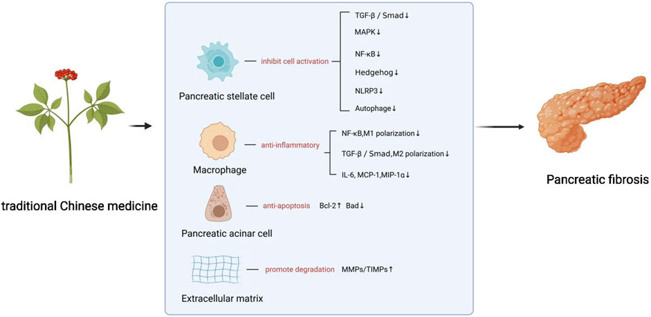 The pathogenesis of PF is orchestrated by intricate cross-talk among acinar cells, macrophages PSCs, which converge on shared signaling pathways. Notably, TCM interventions target this multicellular crosstalk through a system-level approach. Active ingredients from TCM, such as berberine and isoliquiritigenin simultaneously modulate multiple nodes within this network: they suppress macrophage M1 or M2 polarization, and inhibit PSCs activation, primarily through downstream regulation of converging pathways TGF-β/Smad or MAPK. By targeting multiple cell types and pathways synergistically, TCM offers a holistic strategy to disrupt the vicious cycle of pancreatic fibrogenesis, representing a unique therapeutic advantage over conventional single-target agents.