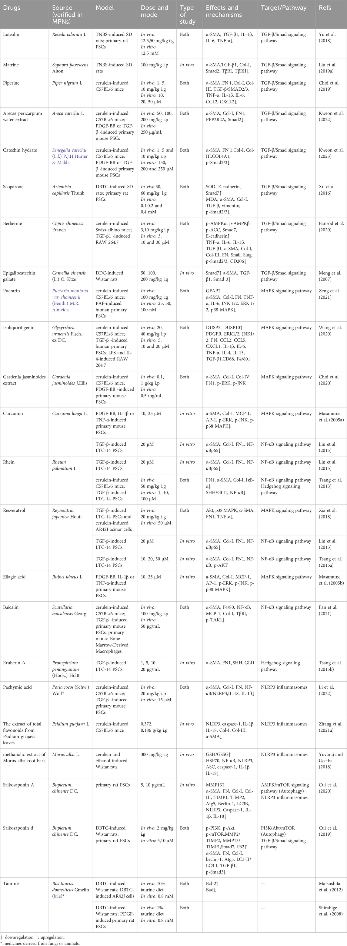 Others compounds: Eruberin A (Table 1) can be extracted from Pronephrium penangianum (Hook.) Holtt. This plant has a long history of use as a folk medicine in Chinese traditional medicine. Eruberin A markedly inhibited NF-κB activation and PI3K/Akt phosphorylation, reducing fibrotic mediator expression in PSCs. Its antifibrotic action was tied to suppressing the PI3K/Akt/NF-κB signaling pathway (Tsang et al., 2015b).