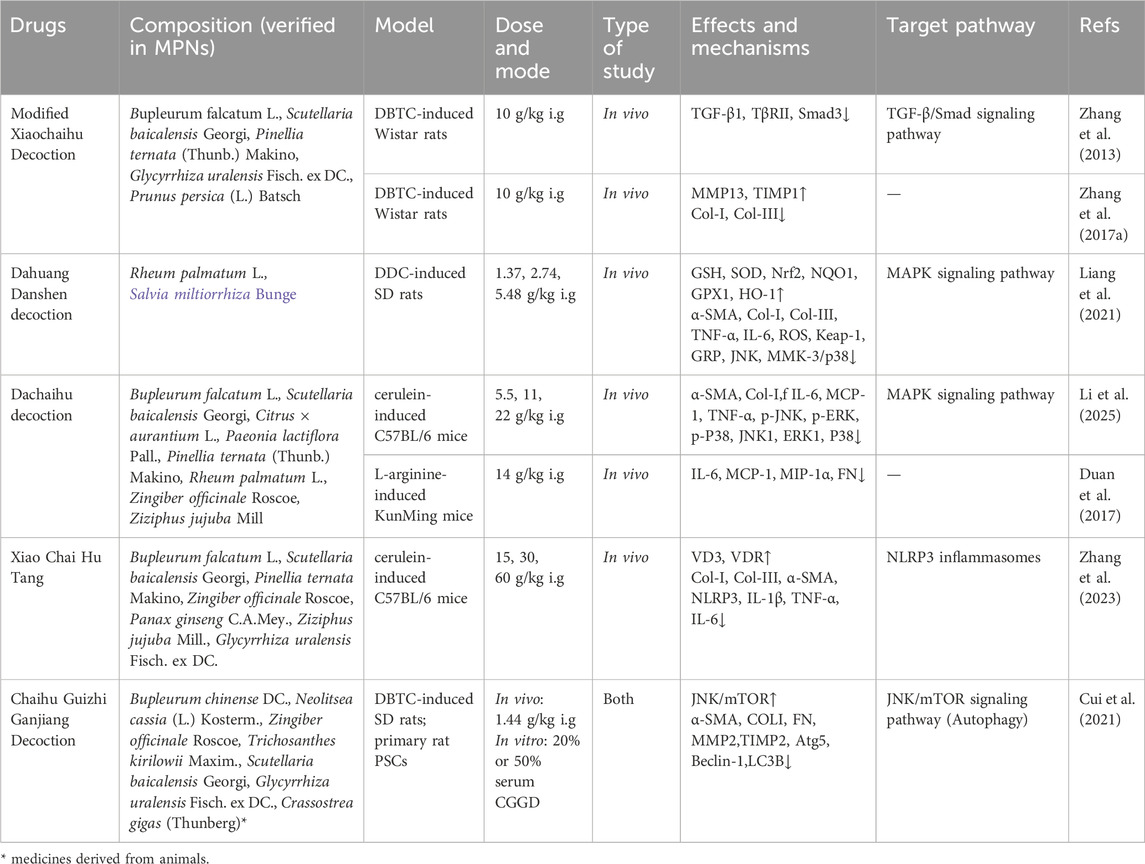 Herbal extracts and TCM formulas: Chaihu Guizhi Ganjiang Decoction (CGGD, Table 2) is a TCM formula that was first described by Zhongjing Zhang in “Shang Han Lun”. It has been widely used in the clinical treatment of digestive in TCM. CGGD suppressed autophagy by down-regulating Atg5, Beclin-1, and LC3B, while enhancing the phosphorylation of mTOR and JNK in pancreatic tissues and PSCs. CGGD mitigated PF and the activation of PSCs by suppressing PSCs autophagy via the JNK/mTOR signaling pathway (Cui et al., 2021).