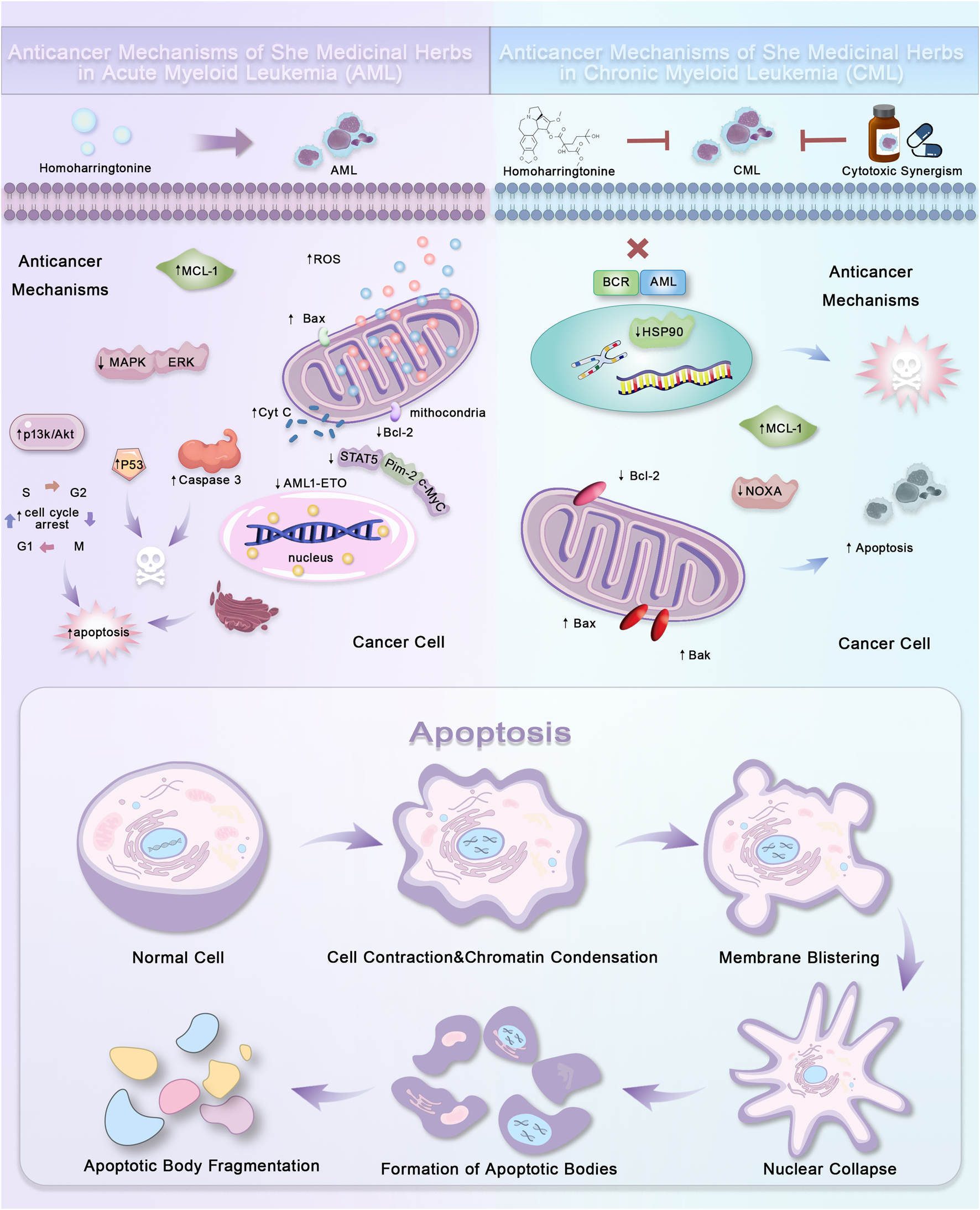 Anticancer mechanisms of She medicinal herbs in acute and chronic myeloid leukemia. The figure illustrates the anticancer mechanisms of She medicinal herbs in the treatment of Acute Myeloid Leukemia (AML) and Chronic Myeloid Leukemia (CML). In AML, Homoharringtonine induces apoptosis by upregulating MCL-1 and ROS, activating Bax, and promoting mitochondrial release of cytochrome c, which triggers a cascade of apoptotic events through p53 activation, caspase 3 and 9, and cell cycle arrest. In CML, Homoharringtonine works in synergy with cytotoxic agents to inhibit BCR-ABL fusion proteins, modulate HSP90, and downregulate Bcl-2 and MCL-1, leading to Bax, Bak, and NOXA activation and apoptosis. The figure also shows the typical apoptotic morphological changes, including cell contraction, chromatin condensation, membrane blistering, apoptotic body fragmentation, and nuclear collapse, which occur during the cancer cell death process. These findings underscore the therapeutic potential of She medicinal herbs in leukemia treatment by targeting key apoptotic pathways.