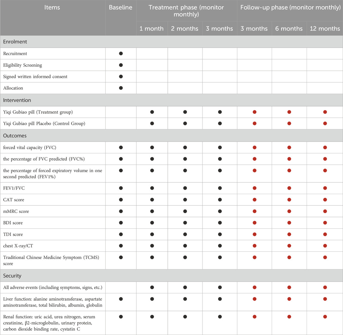 This prospective double-blind randomized controlled trial, registered with the Clinical Trials (registration number: NCT06676800), will implement a 1:1 allocation design randomized to either the Yiqi Gubiao treatment group or placebo-controlled group. Following randomization, a 12-week therapeutic protocol will be administered, during which serial pulmonary function assessments and quality of life evaluations. TCM syndrome differentiation will be quantified through the validated TCM Symptom Score Scale, while safety surveillance will systematically monitor adverse events. The trial adheres to SPIRIT guidelines (Standard Protocol Items: Recommendations for Interventional Trials), with the completed checklist provided in Supplementary Material 1. The complete study workflow is detailed in Figure 1.