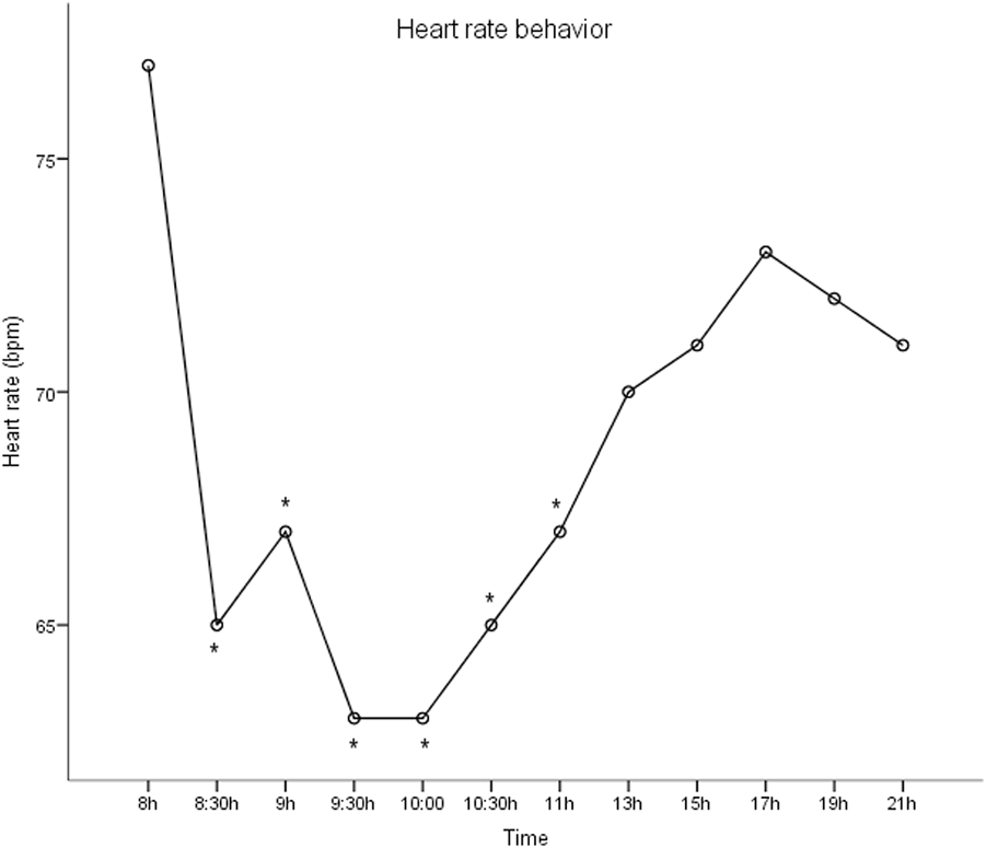 Heart rate behavior during day’s circadian cycle. Mixed-model analysis. *p <0.05.