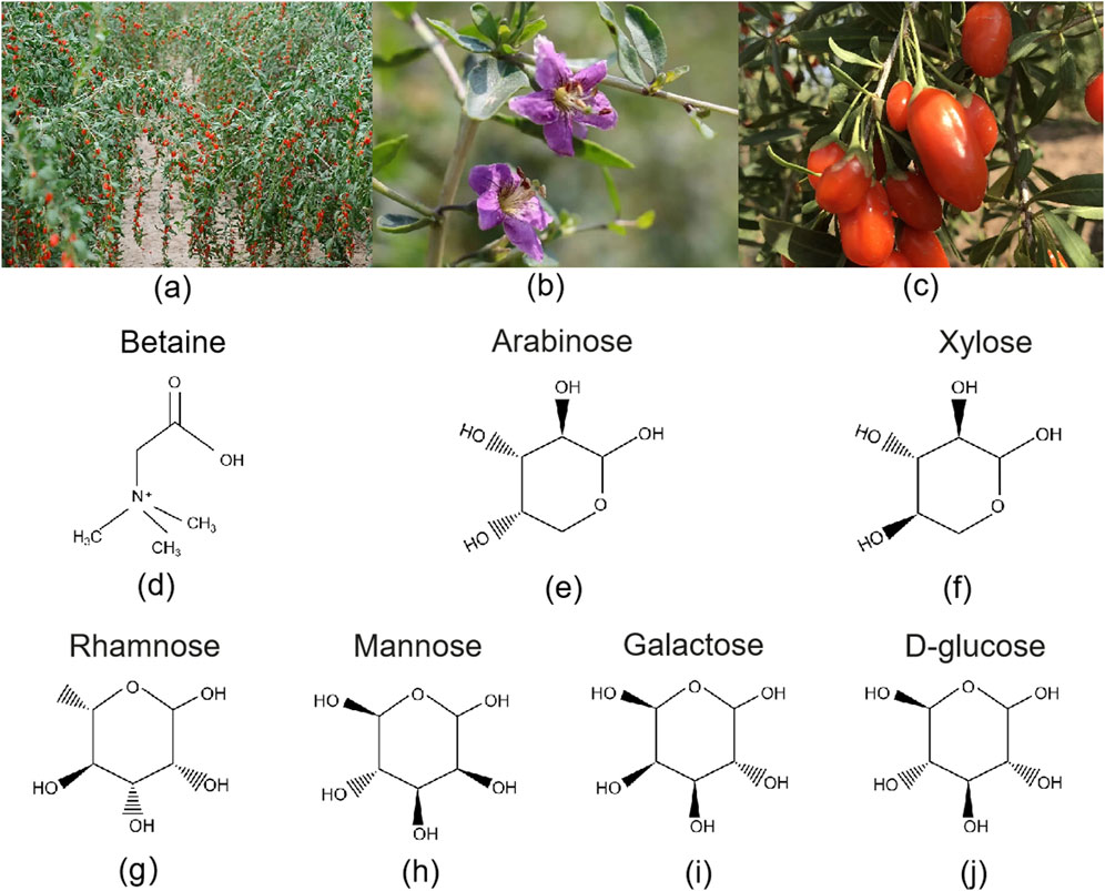 Figure 2. Botanical features and key bioactive compounds of Lycii Fructus. (a) Goji tree with mature fruits, showing its characteristic shrub-like growth habit and elongated red berries; (b) Close-up of a Goji flower, highlighting its delicate purple corolla and prominent stamens; (c) Fresh ripe goji berries, oblong in shape with smooth, waxy surface, 6–8 mm in diameter; (d–j) Chemical structures of representative metabolites found in Lycii Fructus. Betaine (Trimethylglycine, a quaternary ammonium alkaloid); Arabinose (Aldopentose, commonly in furanose form in natural polysaccharides); Xylose (Aldopentose, C-3 epimer of arabinose); Rhamnose (6-Deoxyhexose, L-configuration); Mannose (C-2 epimer of glucose, aldohexose); Galactose (C-4 epimer of glucose, aldohexose); D-glucose (Pyranose-form aldohexose, monomer unit of goji polysaccharides).