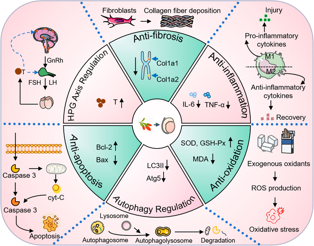 In recent years, a growing body of research has focused on the protective effects of Lycii Fructus on the male reproductive system, suggesting its promising potential in the treatment of male infertility (Yang et al., 2024). This review summarizes recent in vivo and in vitro studies on the effects of goji berries and their active metabolites on male reproductive function. These studies reveal that LBP participates in spermatogenesis, testicular structural protection, and endocrine regulation through multiple pathways (Table 2), thereby improving sperm quality and alleviating reproductive dysfunctions caused by various etiologies. In terms of reproductive endocrinology, LBP has been shown to upregulate hormones associated with the HPG axis, such as GnRH, FSH, and LH, thereby promoting the synthesis and secretion of T, which is essential for spermatogenesis (Shi et al., 2017b). Regarding oxidative stress, LBP demonstrates strong free radical scavenging abilities, significantly enhancing the activities of antioxidant enzymes such as SOD, catalase (CAT), and GSH-Px in testicular tissue while reducing MDA levels. This helps to mitigate damage to spermatogonia, Sertoli cells, and Leydig cells (Meng et al., 2022). Additionally, LBP exhibits pronounced anti-apoptotic effects by upregulating the expression of Bcl-2 and downregulating Bax and Caspase-3, thus preventing excessive apoptosis of germ cells and maintaining testicular homeostasis (Hu et al., 2024). LBP and its metabolites have also been found to improve reproductive dysfunction in animal models by regulating autophagy, modulating immune responses, and inhibiting fibrosis.