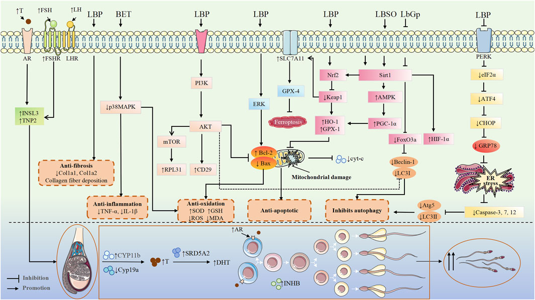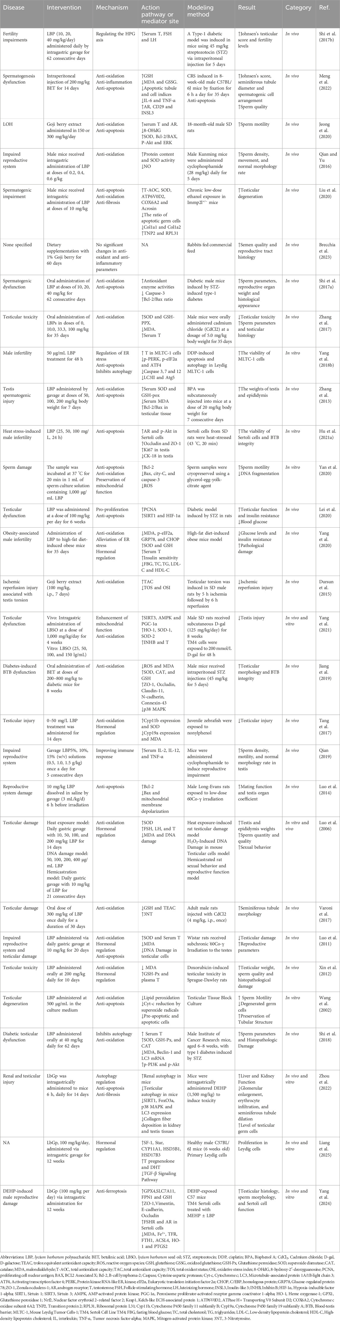 LBP at doses of 0.2, 0.4, and 0.6 g/kg significantly enhanced testicular SOD activity and reduced nitric oxide (NO) levels in a dose-dependent manner, effectively mitigating cyclophosphamide-induced sperm quality deterioration. However, the underlying mechanisms regulating antioxidant enzyme expression by LBP remain to be elucidated LBP (200 mg/kg) effectively reversed doxorubicin-induced elevation of MDA levels and reduction of glutathione peroxidase (GSH-Px) activity, while increasing plasma T levels. This treatment significantly ameliorated doxorubicin-induced testicular weight loss, decreased sperm concentration and motility, and reduced abnormal sperm rates, ultimately attenuating doxorubicin-induced degenerative changes in seminiferous tubules. But the study lacked dose-gradient experiments, and the precise mechanisms underlying its antioxidant effects remain unclear (Xin et al., 2012). LBP at doses of 50, 100, and 200 mg/kg all significantly increased SOD and glutathione GSH-Px activities while reducing MDA content, effectively alleviating bisphenol A (BPA)-induced spermatogenic damage in mouse testes and significantly increasing testicular and epididymal weights. However, these protective effects did not exhibit dose-dependent enhancement. (Zhang et al., 2013). However, Qian & Yu’s study demonstrated that LBP at doses of 0.2, 0.4, and 0.6 g/kg could dose-dependently and significantly enhance testicular SOD activity while reducing nitric oxide (NO) levels, effectively mitigating cyclophosphamide-induced sperm quality deterioration (Qian and Yu, 2016). In the context of radiation-induced injury, LBP significantly antagonizes the deleterious effects of 60Co-γ irradiation on male reproductive function by enhancing antioxidant enzyme activity, reducing DNA damage, maintaining hormonal balance, and improving sexual performance (Luo et al., 2011). Additionally, LBP exhibits therapeutic efficacy in models of metabolic and aging-related testicular injury. In STZ -induced diabetic mice, LBP improves spermatogenesis and preserves testicular architecture by attenuating oxidative stress and inhibiting apoptosis (Shi et al., 2017a). In obesity-induced male infertility, LBP reduces testicular oxidative and endoplasmic reticulum (ER) stress, enhances insulin sensitivity, and restores androgen levels (Yang et al., 2020).