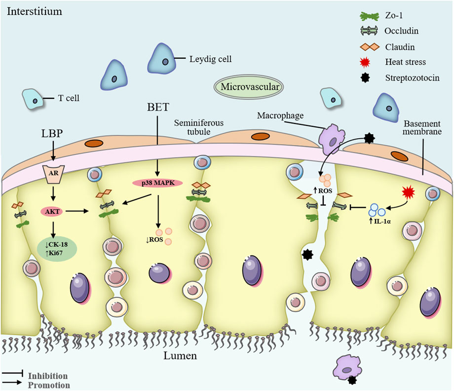 Oxidative stress plays a pivotal role in testicular injury and male reproductive dysfunction. Excessive generation of reactive oxygen species (ROS) not only damages testicular tissue structure, impairs spermatogenic cells and the BTB, but also induces cell apoptosis and disrupts T synthesis, ultimately leading to decreased fertility (Leisegang et al., 2017). LBP has been extensively reported to exhibit potent antioxidant properties, thereby mitigating testicular injury and reproductive dysfunction caused by various environmental and pathological stressors. In multiple animal models, LBP significantly enhances endogenous antioxidant defenses and reduces oxidative stress, effectively alleviating testicular damage induced by chemotherapeutic agents (e.g., cyclophosphamide and doxorubicin) (Qian and Yu, 2016; Xin et al., 2012), environmental toxins (e.g., bisphenol A and cadmium) (Varoni et al., 2017; Zhang et al., 2013), ionizing radiation (e.g., 60Co-γ irradiation) (Luo et al., 2011), and metabolic disturbances such as diabetes and obesity (Shi et al., 2017a; Yang et al., 2020).