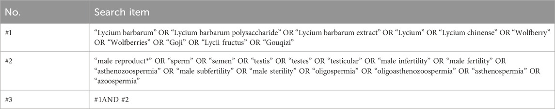 Two authors (Dongyue Ma and Dexiu Li) searched for relevant articles according to the search terms and summarized the results. Original articles involving Lycii Fructus for male fertility disorders were included, and duplicate studies were eliminated. Some studies were excluded after analyzing the title, abstract, and full text. The reference lists of each study were also checked when necessary to include relevant research that might have been missed in the initial search. Dissenting opinions were submitted to another author (Guanchao Du) for adjudication throughout the entire process.