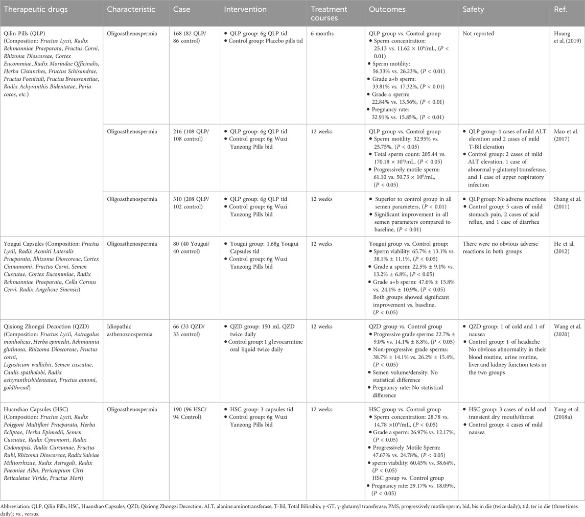 A randomized controlled trial (n = 66) demonstrated that compared to levocarnitine, 12-week treatment with Qixiong Zhongzi Decoction (QZD; 150 mL bid) significantly improved sperm progressive motility (22.7% ± 9.0% vs. 14.1% ± 8.8%) and non-progressive motility (38.7% ± 14.1% vs. 26.2% ± 15.4%) in patients with idiopathic asthenozoospermia (all P < 0.05), while no intergroup differences were observed in semen volume, density, or pregnancy rates. During treatment, two mild adverse events occurred in the QZD group (1 case of cold and 1 case of nausea), and 1 case of headache was reported in the control group, all of which resolved spontaneously without intervention (Wang et al., 2020). A multicenter randomized open-label trial (n = 190 completers) demonstrated that 12-week treatment with Huanshao Capsules (HSC; 3 capsules tid) significantly improved semen parameters in oligoasthenospermia patients with spleen-kidney asthenia compared to Wuzi Yanzong Pills (6 g bid), with time-dependent increases in sperm concentration (baseline 14.78 to 28.78 × 106/mL), progressive motility [grade a: 12.17%–26.97%; Progressively Motile Sperm (PMS): 24.78%–47.67%], and viability (38.64%–60.45%). HSC also achieved higher pregnancy rates (29.17% vs. 18.09%, P < 0.05). Safety monitoring revealed 3 cases of mild and transient dry mouth/throat in the HSC group, which resolved with increased water intake, while the control group reported 4 cases of gastrointestinal discomfort (nausea with/without vomiting) that improved after adjusting medication timing to 30 min post-meal (Yang et al., 2018a).