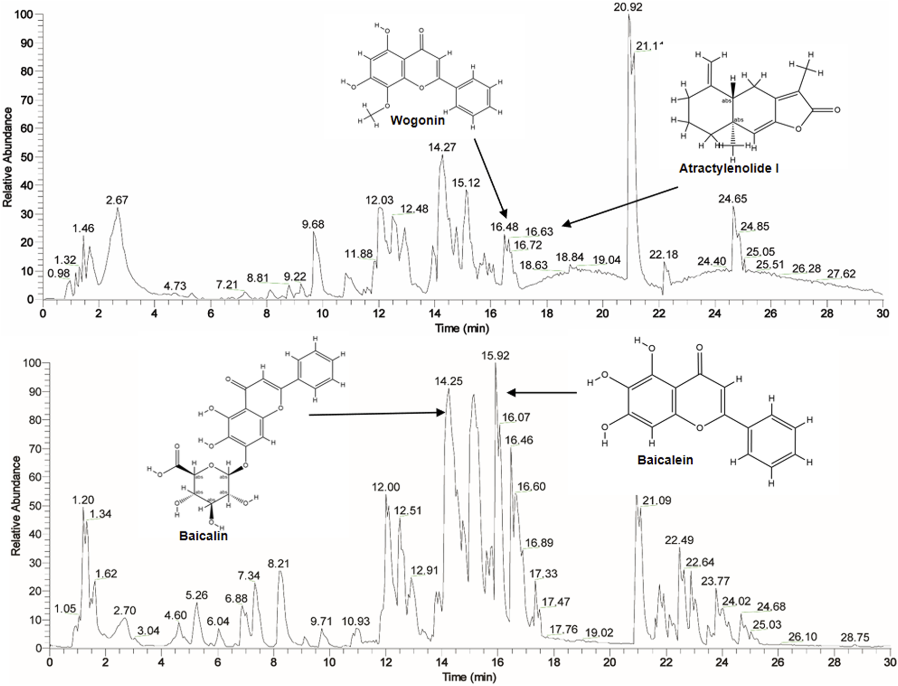 Chromatograms showing the relative abundance of compounds over time, highlighting Wogonin, Atractylenolide I, Baicalin, and Baicalein with their chemical structures. The time is measured in minutes along the x-axis, with peaks annotated with specific time points indicating compound presence.