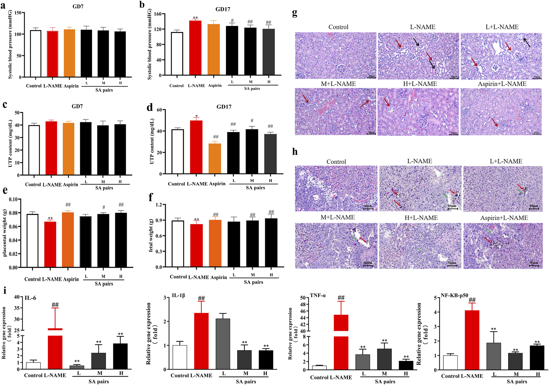 Protective effects of SA preeclampsia induced by L-NAME (n = 6). (a,b), blood pressure. (c,d), urine protein (UTP). (e,f), placenta (or fetal) weight. (g), HE staining of kidney (Black arrow:the renal tubules were severely vacuolated, red arrow: a large number of nuclei were exposed and shed). (h) placenta tissue (Red arrows:necrotic foci, green arrows:calcified foci. The magnification of the HE pathological staining images is set at 20 times). (i) mRNA level of inflammatory factors in placenta. **p < 0.01, Compared with Control group, #p < 0.05, ##p < 0.01, Compared with L-NAME group.