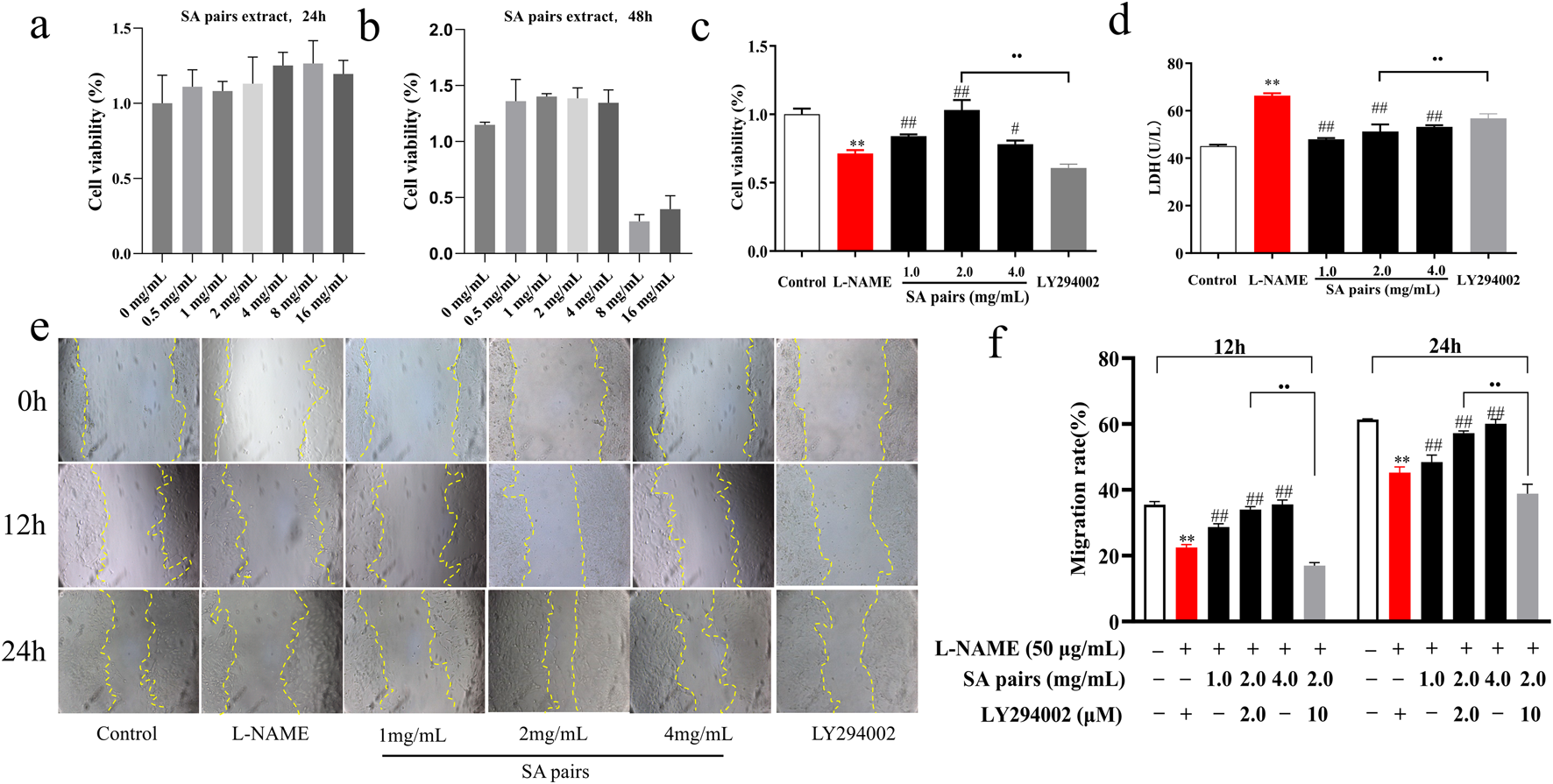Graphs and images showing the effects of SA pairs on cell viability, LDH levels, and migration. Panels a and b display cell viability after 24 and 48 hours, respectively, with various SA pair concentrations. Panel c compares control and L-NAME treatments with SA pairs. Panel d shows LDH levels. Panel e provides microscopic images of wound healing at 0, 12, and 24 hours under different treatment conditions. Panel f illustrates migration rates at 12 and 24 hours for various treatments, indicating significant differences (**p < 0.01, ##p < 0.01).
