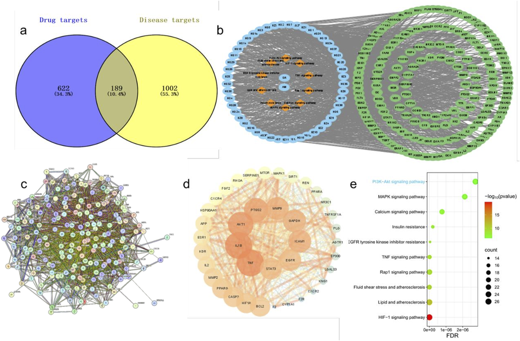 (a) Venn diagram showing overlap between drug targets and disease targets with 622 drug-only, 1002 disease-only, and 189 shared targets. (b) Network diagram highlighting interactions between pathways. (c) Complex network of biological interactions. (d) Network focusing on inflammatory and signaling pathways with key nodes like TNF and STAT3. (e) Dot plot ranking signaling pathways by p-value significance, with PI3K-Akt as the top pathway.