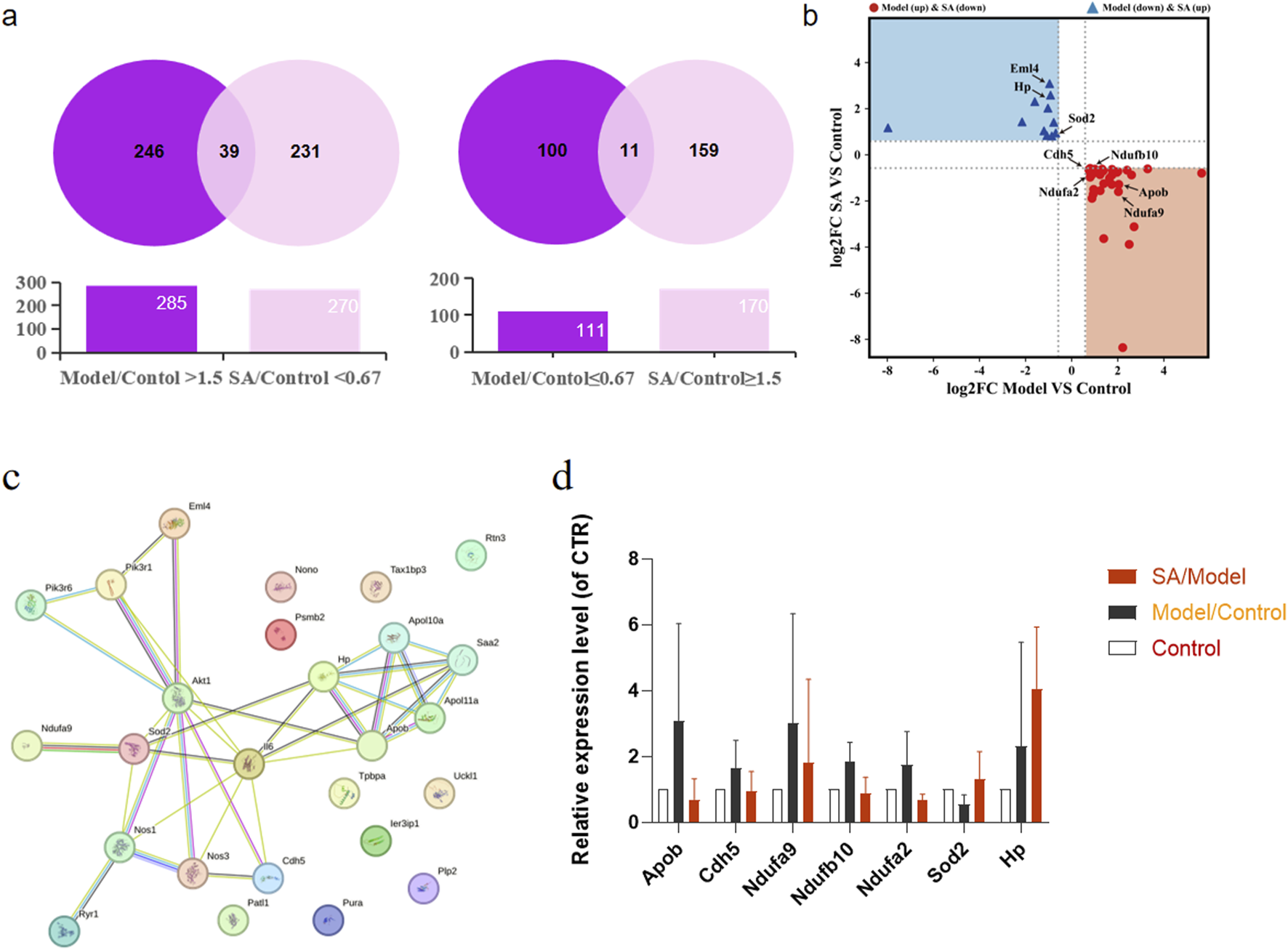 Panel a shows two Venn diagrams with overlapping sections, indicating gene expression differences in two comparisons, each with a bar chart below showing total and shared gene counts. Panel b displays a scatter plot comparing log2 fold changes (FC) between model versus control and SA versus control groups, highlighting specific genes with varied expression patterns. Panel c is a network diagram depicting interactions among multiple genes. Panel d consists of a bar chart comparing relative expression levels of various genes across different experimental conditions: SA/Model, Model/Control, and Control.