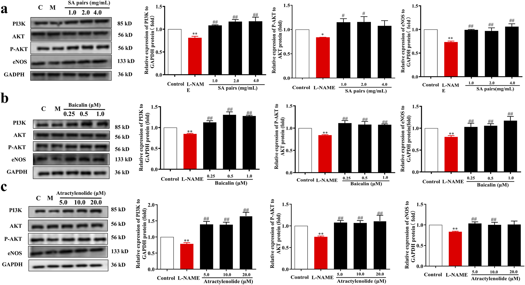 Influence of SA, baicalin and atractylenolide I treatment on the expression of PI3K/AKT/eNOS in vitro (n = 3). Western blot bands for PI3K, P-AKT and eNOS. (a) SA, (b) baicalin, (c) atractylenolide I. *p<0.05, **p<0.01, Compared with Control group, ##p<0.01, Compared with the L-NAME group.