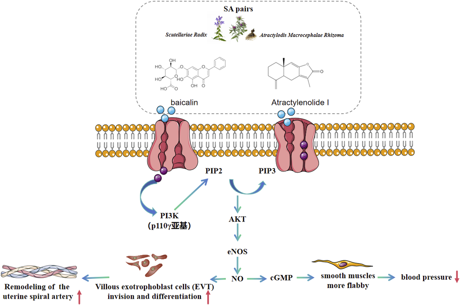 It was demonstrated that SA could significantly ameliorate the systolic blood pressure, urinary protein levels, and pathological damage in the kidneys and placenta of mice. Moreover, in vitro experiments further validated the promoting effects of SA, baicalin, and atractylenolide I on the proliferation and migration of HTR-8/SVneo cells. Baicalin and atractylenolide I are the main active and quality control components of SA. Network pharmacology analysis, quantitative proteomics and molecular docking revealed that the PI3K/Akt pathway is a potential mechanism through which SA alleviates preeclampsia. Further investigations showed that SA could reverse L-NAME-induced inhibition of the PI3K/p-Akt/Akt signaling pathway, upregulating eNOS expression and ultimately alleviating vasoconstriction and other preeclampsia-related symptoms.