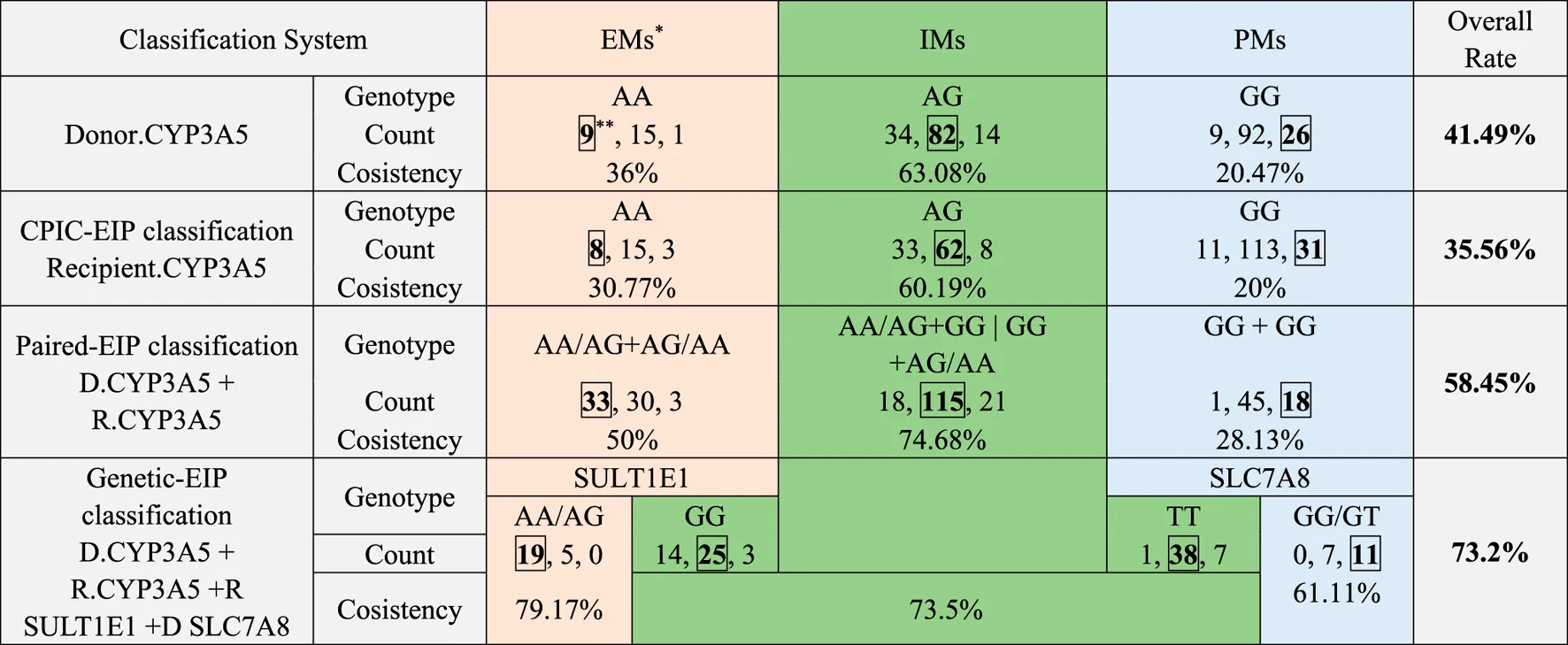In recent years, pharmacogenomics research has provided an active strategy that can forecast drug metabolism phenotypes according to genotype (Pirmohamed, 2023; Sadee et al., 2023; Strother et al., 2025). Enzymes in the cytochrome P450 (CYP) 3A family are responsible for the oxidative metabolism of tacrolimus (Mevizou et al., 2024; Wang et al., 2025; So et al., 2025). Recent guidelines for the use of tacrolimus proposed by the Clinical Pharmacogenetics Implementation Consortium (CPIC) are trying to provide information relevant to the interpretation of CYP3A5 genotype and dosing. The recipients’ metabolism phenotypes were accordingly assigned to 3 categories, including Extensive Metabolizer (EM, an individual carrying two functional alleles) with CYP3A5 rs776746 AA, Intermediate Metabolizer (IM, an individual carrying one functional allele and one nonfunctional allele) with CYP3A5 rs776746 AG, and Poor Metabolizer (PM, an individual carrying two nonfunctional alleles) with CYP3A5 rs776746GG. This simple CIPC-EIP classification for tacrolimus is commonly recommended after many organ transplant operations, including kidney, heart, lung, and hematopoietic stem cell transplants, and liver transplants in which the donor and recipient genotypes are identical (Rod et al., 2022). However, almost all clinical liver transplantation is allogeneic, and the genotypes of the recipients and their corresponding donors were different.
