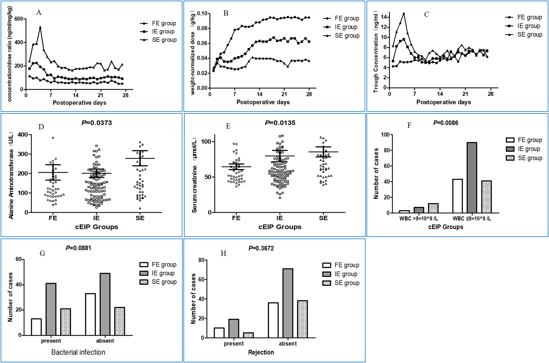 Clinical characteristics of patients in different groups under clinical-FIS classification. (A) The changing curves of dose-adjusted trough blood concentrations in FE, IE and SE group at 28 days postoperatively. (B) The weight-adjusted dose of each group based on this retrospective clinical-FIS classification can be effectively distinguished. The dose of tacrolimus was low at the outset and was generally increased 1 or 2 weeks after the operation, reaching a plateau. (C) The changing curves of concentrations in FE, IE and SE group at 28 days postoperatively. (D) The median of alanine aminotransferase in clinical-FE, clinical-IE and clinical-SE group patients in the first postoperative week was 121.7 U/L, 146.4 U/L and 191.1 U/L respectively, with significant differences (P = 0.0373) among the three groups. (E) The median of serum creatinine in clinical-FE, clinical-IE and clinical-SE group patients in the first postoperative week was 57.75 μmol/L, 58.5 μmol/L and 74.0 μmol/L respectively, also with significant differences (P = 0.0135) among the three groups. If you prefer, you can place both the actual figures and captions logically through the text near where they are cited rather than at the end of the file (but not both). (F) The percentage of recipients carrying higher leukocyte count in clinical-FE (6.52%, 3/46), clinical-IE (7.22%, 7/97) and clinical-SE (22.6%, 12/53) group patients in the first postoperative week than normal, with significant differences among the three groups (P = 0.0086). (G) The percentage of recipients with bacterial infection in clinical-FE (28.3%, 13/46), was obviously lower than that in clinical-IE (45.6%, 41/90) and clinical-SE (48.8%, 21/43) group respectively, and there were no significant differences among the three groups (P = 0.0881). (H) The percentage of recipients with rejection reaction in clinical-FE, clinical-IE and clinical-SE group patients in the follow-up period was 21.7% (10/46), 21.1% (19/90) and 11.6% (5/43) respectively, and there were no significant differences among the three groups (P = 0.3672).
