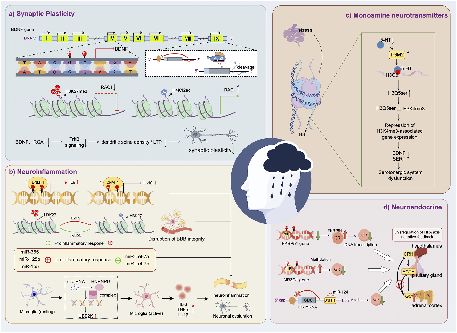 Epigenetic regulation of MDD-related pathophysiological mechanisms. (a) Synaptic plasticity is impaired by epigenetic downregulation of BDNF and RAC1. (b) Neuroinflammation is promoted through epigenetic control of cytokine expression and microglial activation. (b) Serotonergic dysfunction results from stress-induced disruption of histone serotonylation and gene repression. (d) HPA axis imbalance is driven by epigenetic regulation of glucocorticoid receptor signaling.