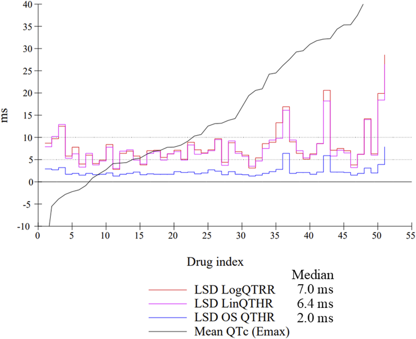 Individual LSD values from all studies (n = 51) using the LogQTRR and LinQTHR models and the one-step (OS) QTc model (ΔQTc). Median: median LSD value calculated of all studies. Drugs were ranked in ascending order on the basis of maximum effect on QTc.