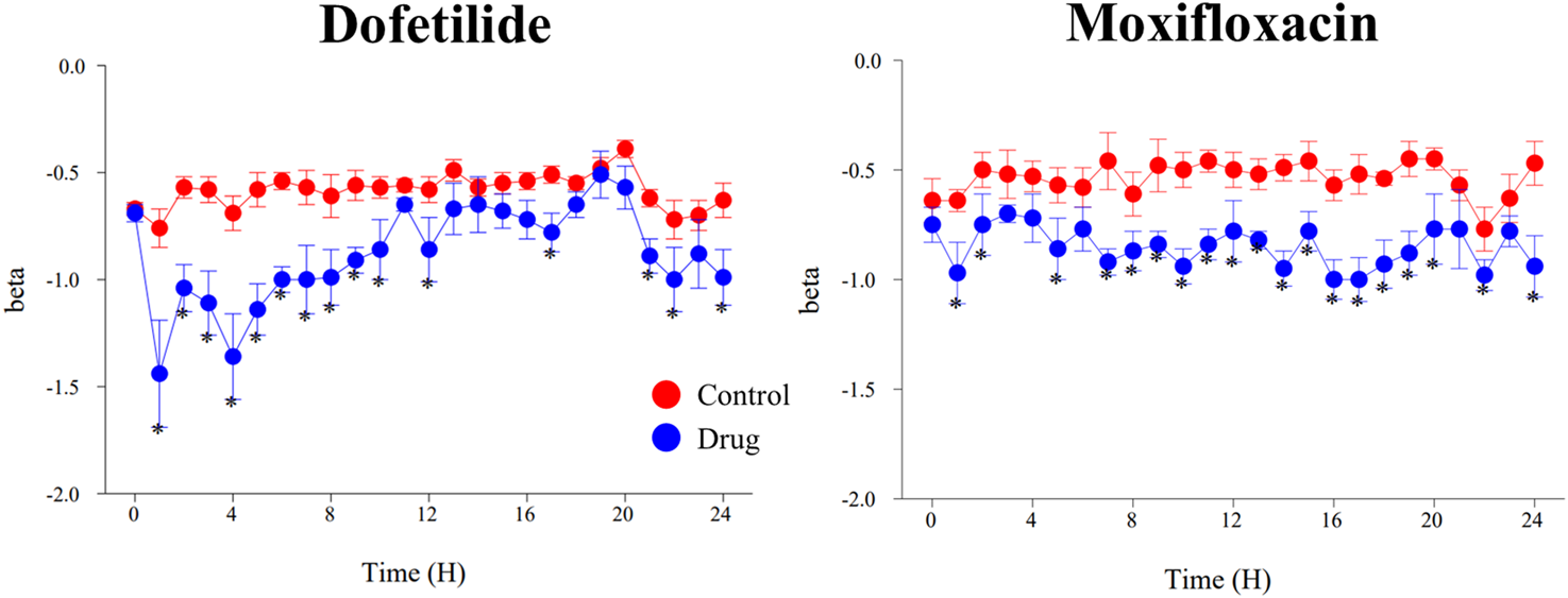 Effects of dofetilide (1 mg/kg, po) and moxifloxacin (90 mg/kg, po) on β-slope calculated with the one-step QTc model. Mean values ±SEM, *: P ≤ 0.05 when compared to control session.