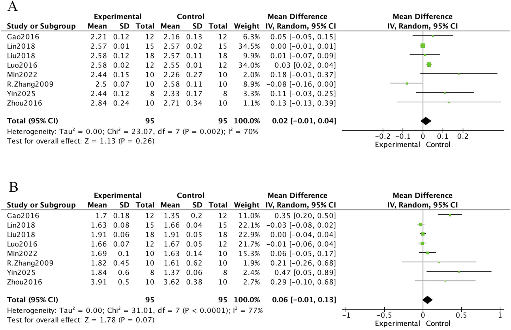 ![Forest plots compare experimental and control groups across multiple studies. In plot A, the overall mean difference is 0.02 with a 95% confidence interval of [-0.01, 0.04]. In plot B, the mean difference is 0.06 with a 95% confidence interval of [-0.01, 0.13]. Both plots present study-specific mean differences, confidence intervals, and weights. Heterogeneity statistics and overall effect tests are included.](https://www.frontiersin.org/files/Articles/1619687/xml-images/fphar-16-1619687-g008.webp)
