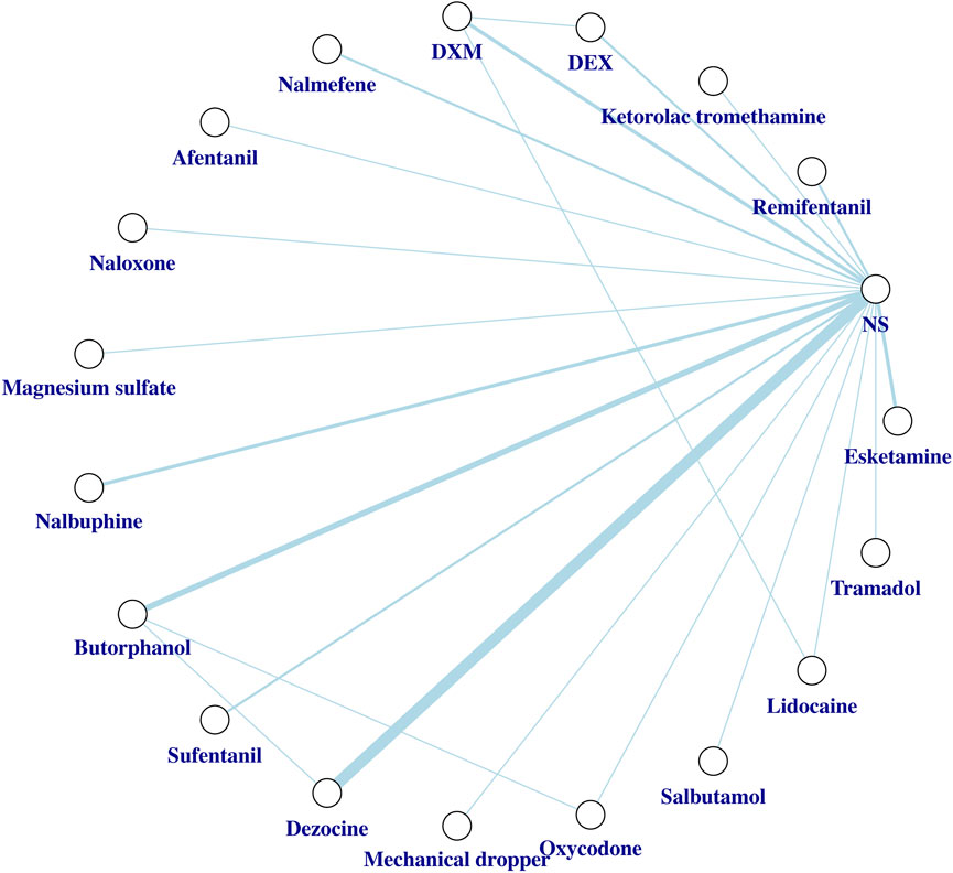 The intervention group comprised 2,815 patients undergoing pharmacological management or mechanical dropper, whereas the control group included 2,295 patients receiving normal saline. Eighteen distinct interventions were analyzed, comprising dezocine, nalbuphine, butorphanol, alfentanil, oxycodone, remifentanil, esketamine, ketorolac tromethamine, nalmefene, magnesium sulfate, salbutamol, dexmedetomidine, sufentanil, lidocaine, dexamethasone, naloxone, tramadol, and mechanical dropper (flow rate at 1 mL/s). Among them, dezocine (10 articles), butorphanol (5 articles), nalbuphine (3 articles), sufentanil (3 articles), esketamine (3 articles), dexamethasone (3 articles), dexmedetomidine (2 articles), nalmefene (2 articles), and remifentanil (2 articles) were discussed in more than 2 studies.