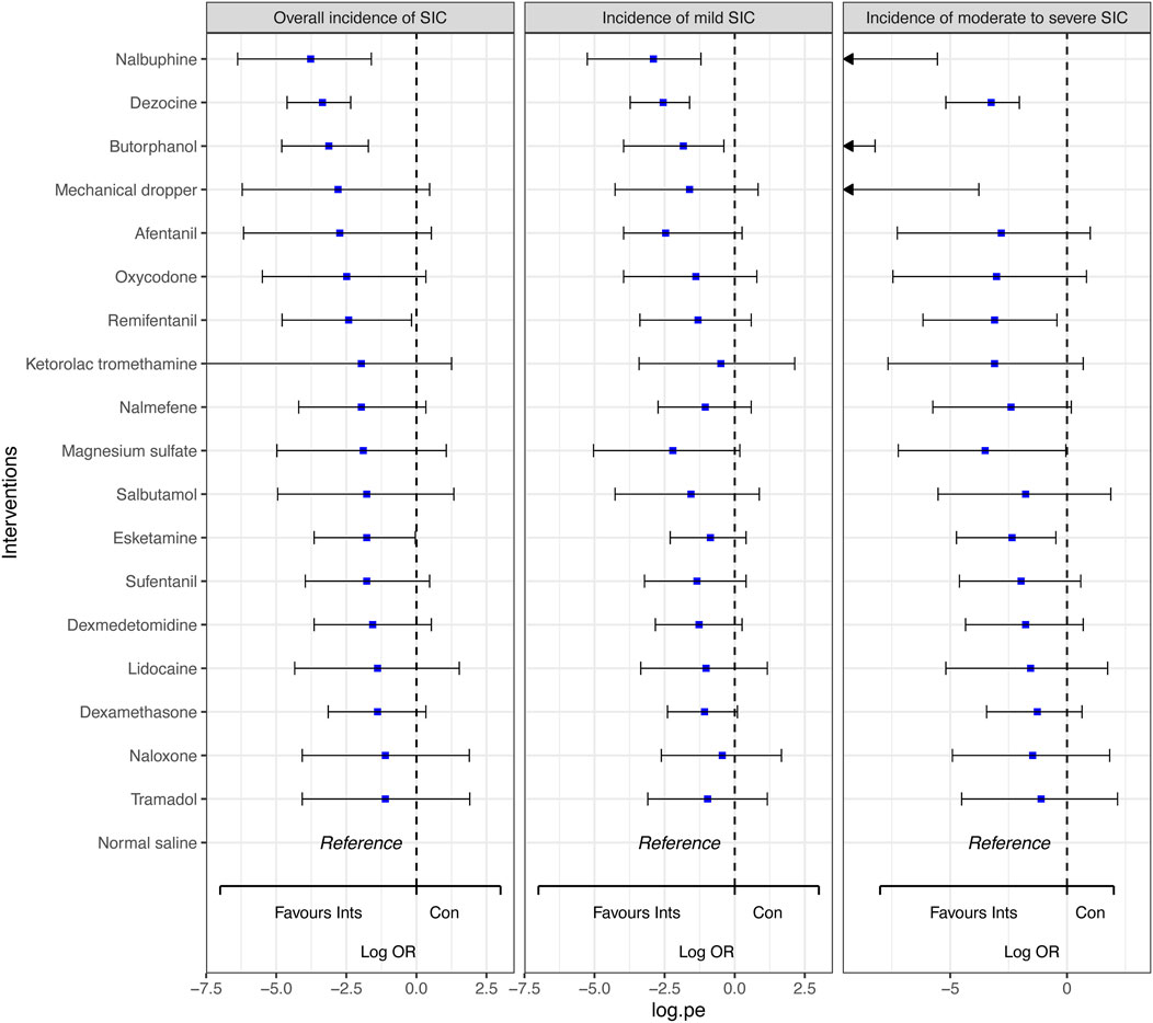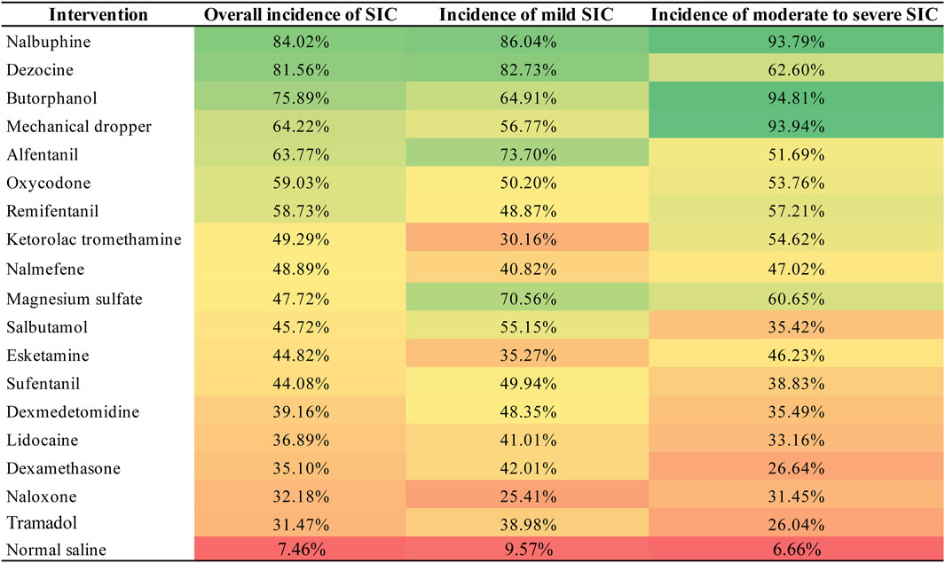 In comparison to normal saline, dezocine (OR 0.03, 95% CI 0.01 to 0.10; high-quality evidence), nalbuphine (OR 0.02, 95% CI 0.00 to 0.20; high-quality evidence), butorphanol (OR 0.04, 95% CI 0.01 to 0.18; high-quality evidence),remifentanil (OR 0.09, 95% CI 0.01 to 0.84; moderate-quality evidence), and esketamine (OR 0.17, 95% CI 0.03 to 0.96; moderate-quality evidence) significantly decreased the overall incidence of SIC. Similarly, dezocine (OR 0.08, 95% CI 0.02 to 0.20; high-quality evidence), nalbuphine (OR 0.06, 95% CI 0.01 to 0.30; high-quality evidence), and butorphanol (OR 0.16, 95% CI 0.02 to 0.68; moderate-quality evidence) significantly reduced the incidence of mild SIC. Dezocine, nalbuphine, butorphanol, mechanical dropper, remifentanil, magnesium sulfate and esketamine significantly reduced the incidence of moderate to severe SIC. While the other interventions indicated a trend in decreasing the incidence of SIC, the results were not statistically significant.