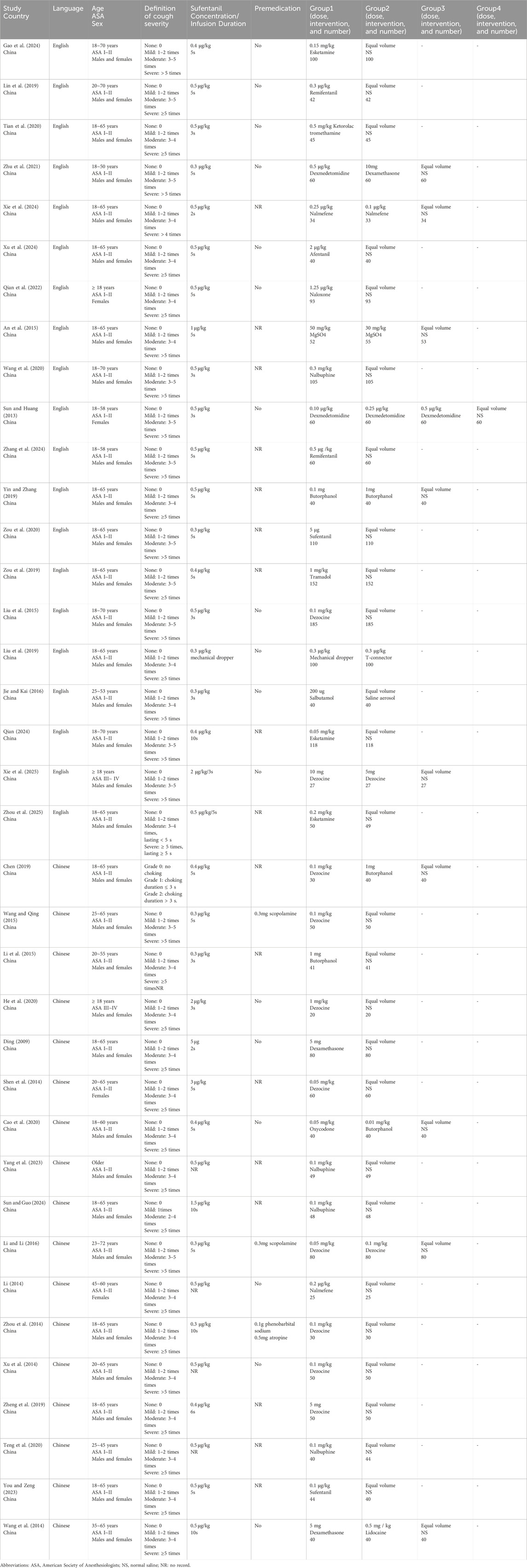Sufentanil is a potent mu-opioid receptor agonist characterized by rapid action, strong analgesic properties, prolonged duration, stable hemodynamics, and a high therapeutic index, making it an optimal choice for opioid analgesia during the induction of general anesthesia (Xue et al., 2008). SIC is prevalent in anesthesia practice, with some studies indicating an incidence rate as high as 64.7% (Xie et al., 2024). Coughs can vary in severity, with mild cases being self-limiting. However, severe cough may elevate the risk of aspiration pneumonia (Smith and Houghton, 2013) and postoperative nausea and vomiting (Peringathara and Robinson, 2016). In severe cases, it can elevate intracranial, intraocular, and intraabdominal pressures, potentially leading to various adverse effects in patients with high-risk comorbidities (Schug et al., 1992). Consequently, implementing effective interventions to prevent sufentanil-induced cough (SIC) in clinical settings is crucial for saving lives, improving quality of life, enhancing patient satisfaction, and optimizing healthcare resource utilization (Liu et al., 2023).
