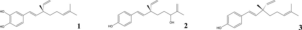 Otholobium glandulosum (L.) J.W. Grimes, also known as Psoralea glandulosa L. or popularly as “culén,” belongs to the Fabaceae family. This shrub is characterized by producing resinous exudates from the glandular trichomes that cover the surface of its leaves and stems (Madrid and Silva, 2024). It has traditionally been used as a cicatrizant, anti-hemorrhoidal, and antiseptic for treating bacterial and fungal infections and skin diseases (Krishna et al., 2022). Its resinous leaves are rich in multiple bioactive compounds, such as 3-hydroxy-bakuchiol (1), 12-hydroxy-bakuchiol (2), and bakuchiol (3) (see Figure 1) (Backhouse et al., 2001; Madrid et al., 2012a; Madrid et al., 2012b; Madrid et al., 2015a).