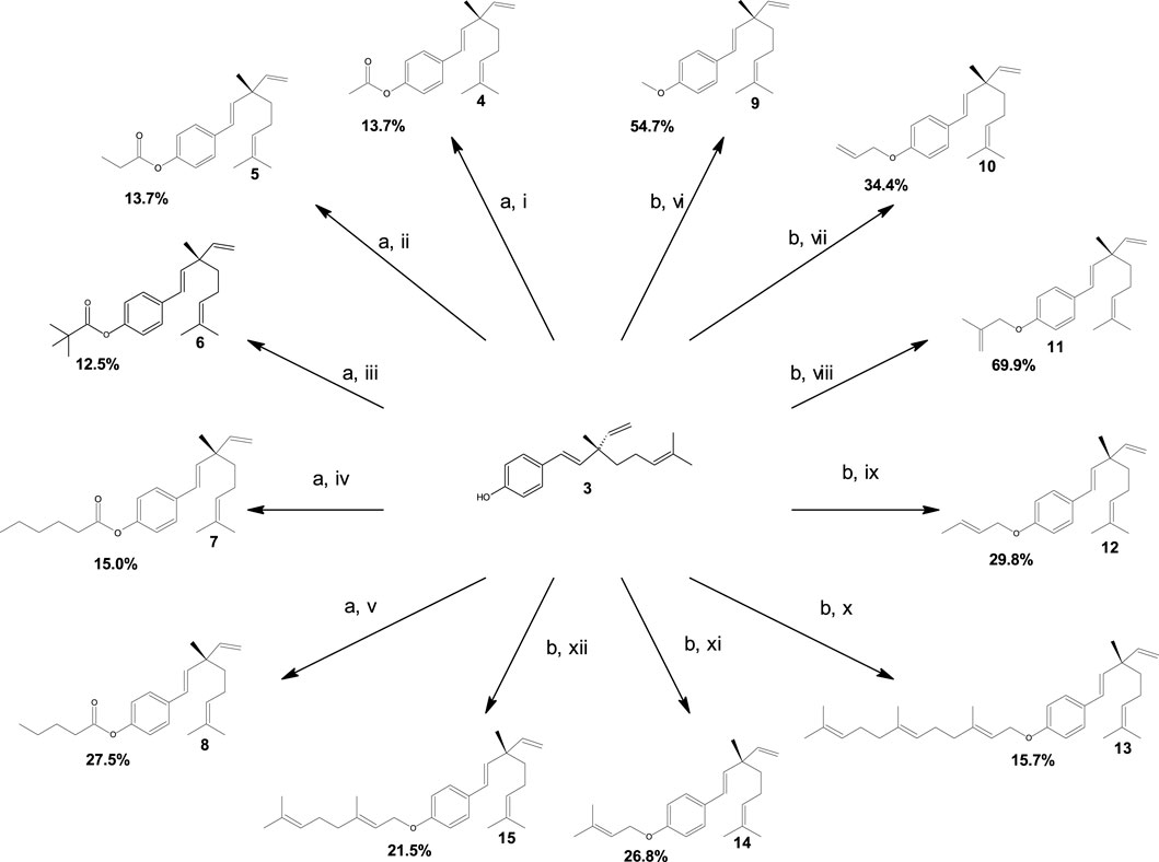 Scheme 1. Synthesis and yields of compounds 4–15. Reagents and conditions: (a) 4-dimethylaminopyridine, pyridine, and dichloromethane; stirring at room temperature for 30 min; (i) acetic anhydride, (ii) propionic anhydride, (iii) trimethylacetic anhydride, (iv) hexanoic anhydride, and (v) valeric anhydride. (b) K2CO3 and acetone; reflux at 75 °C for 6 h; (vi) iodomethane, (vii) allyl bromide, (viii) 3-bromo-2-methylpropene, (ix) crotyl bromide, (x) farnesyl bromide, (xi) prenyl bromide, and (xii) geranyl bromide.