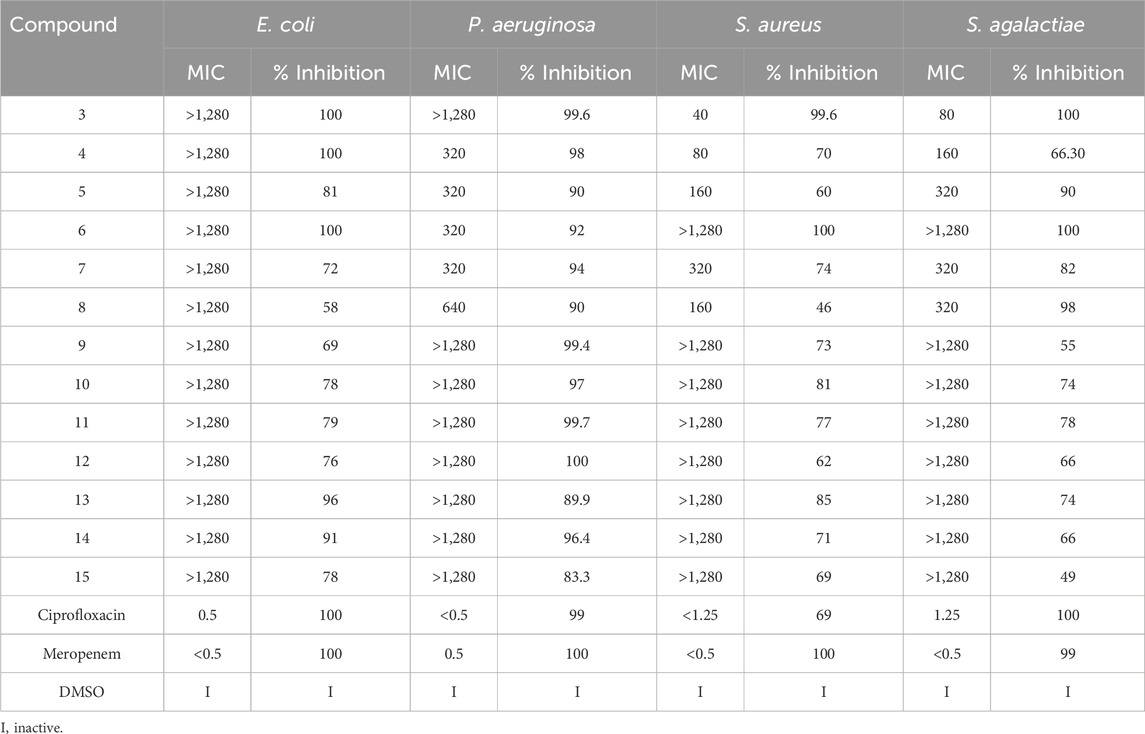 All synthesized compounds 4–15 showed bactericidal activity against P. aeruginosa. Among them, derivatives 6 and 7 were the most potent. Specifically, compound 6 achieved 90% growth inhibition, whereas compound 7 achieved 94% inhibition. Both presented an MIC of 320 μg/mL and very similar EC50 values of 31.6 μg/mL and 30.74 μg/mL, respectively (Tables 1 and 2). In stark contrast, it is important to note that none of these synthetic derivatives demonstrated bactericidal activity against E. coli.