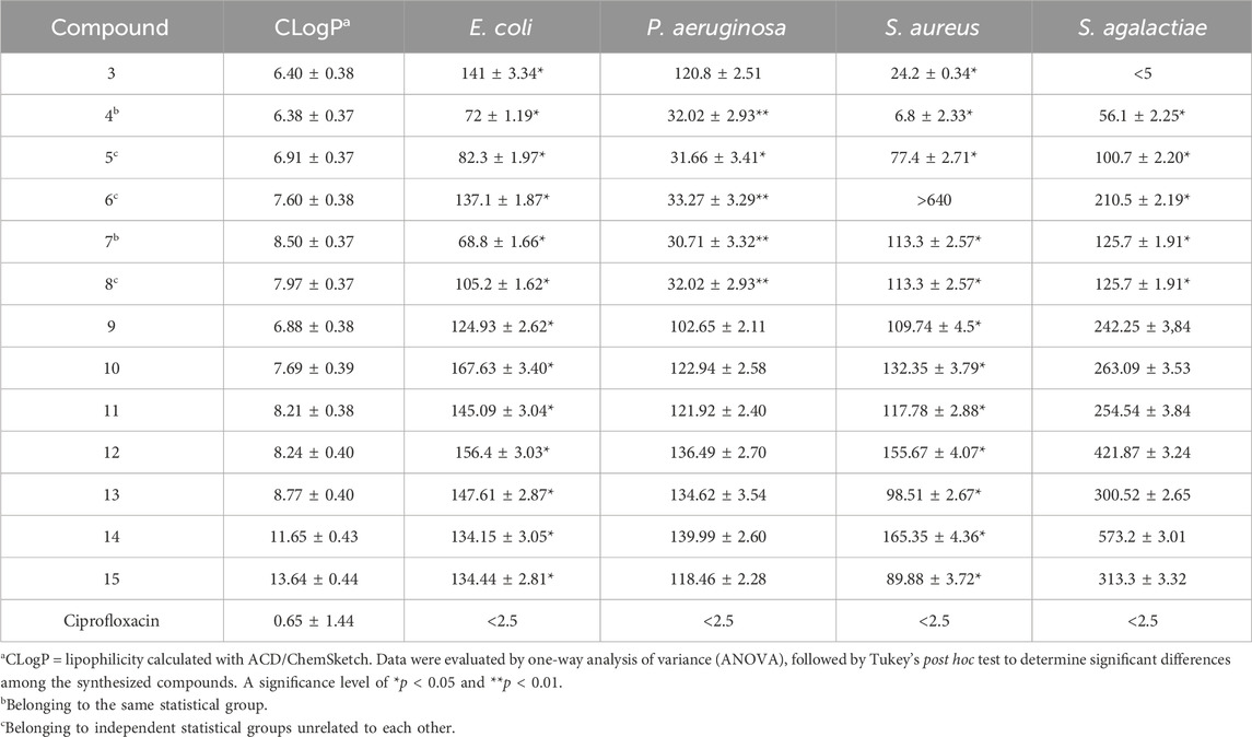 The minimum inhibitory concentration (MIC) of the synthetic derivatives was determined using the protocol mentioned in the literature (Díaz et al., 2018), with minor modifications to the broth dilution method for each of the series evaluated. Ciprofloxacin™ and meropenem™ were used as positive controls, and the same concentrations and evaluation conditions were applied as described earlier. To obtain the effective concentration (EC50) of each compound, the percentage of inhibition for each treatment and concentration was fit to a dose–response equation (Olea et al., 2019). The analysis of the fit was performed with Origin 8.0 software. Microsoft Excel 365™ software (Microsoft Corporation, Redmond, WA, United States) was used for statistical analysis, applying a one-way ANOVA and Tukey’s test to observe the relationship between the synthesized compounds. A p-value <0.05 was used to evaluate the statistical significance of the data.