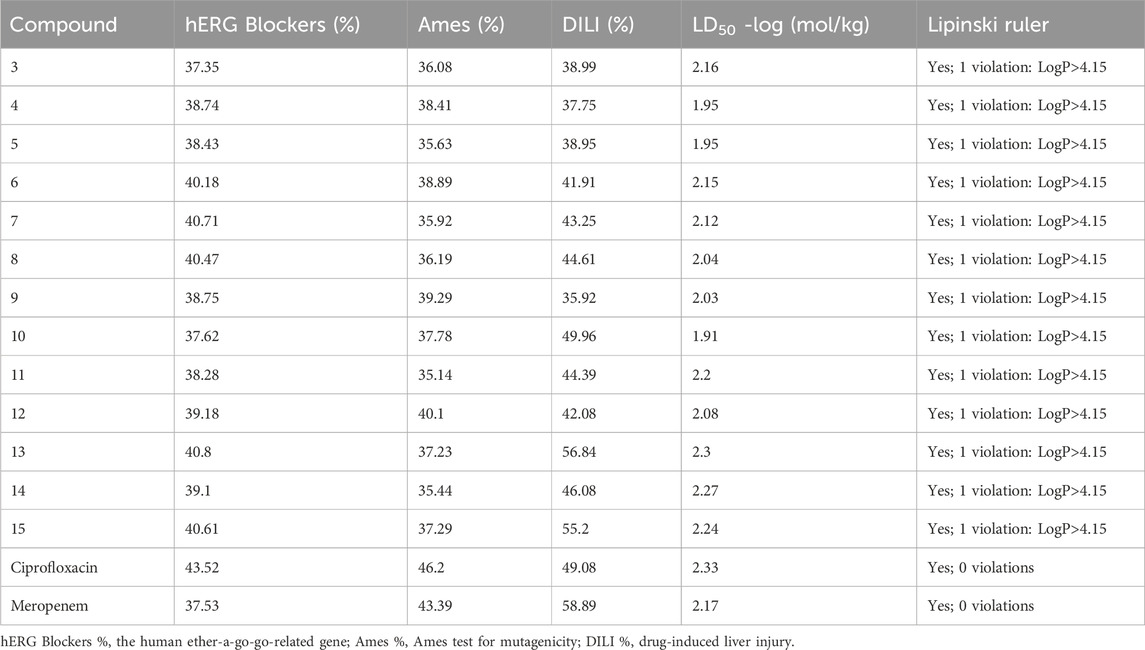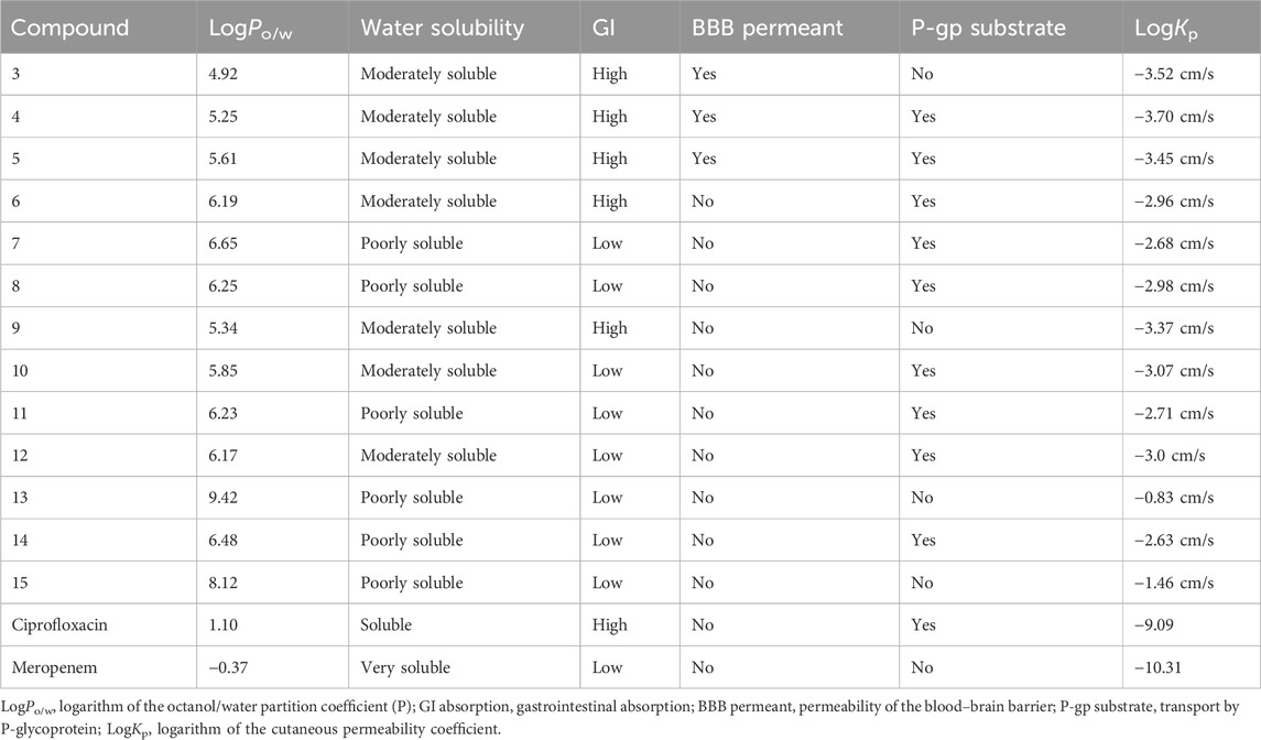 When compared with the reference antibiotics such as ciprofloxacin and meropenem, clear differences were observed. Ciprofloxacin and meropenem presented markedly lower LogP values (1.10 and −0.37, respectively), which is in line with their higher solubility in aqueous media. This contrasts with the moderate-to-low solubility of the synthetic derivatives, highlighting a potential formulation challenge. On the other hand, ciprofloxacin displayed extremely low skin permeability (LogKp −9.09 cm/s), whereas the synthetic derivatives exhibited higher permeability, which could be advantageous in contexts outside systemic oral administration. These comparisons emphasize that although classical antibiotics possess favorable solubility and lower lipophilicity, the derivatives studied here may require formulation strategies to optimize delivery.