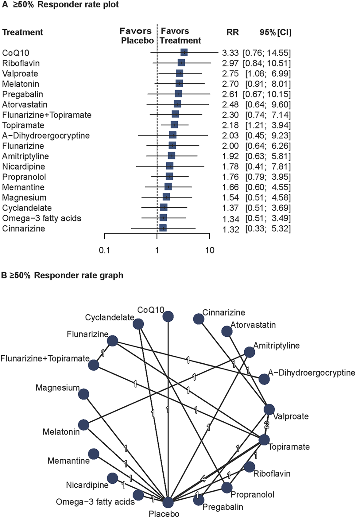 Association of Treatment With 50% or Greater Responder Rate. (A) ≥ 50% Responder rate plot. (B) ≥ 50% Responder rate graph. Forest plot (A) and network graph (B) displaying treatments achieving at least a 50% reduction in headache frequency, defined as the number of patients with at least 50% headache frequency reduction after treatment compared with baseline. Risk ratios (RRs) were calculated using a random effects model due to significant heterogeneity (I2 = 72.7%). Valproate, and topiramate showed significant efficacy compared with placebo. Data were derived from 20 studies (Tuca et al., 1989; Peikert et al., 1996; Schoenen et al., 1999; Bussone et al., 1999; Pradalier et al., 2001; Edwards et al., 2003; Silvestrini et al., 2003; Mei et al., 2004; Sandor et al., 2005; Silberstein et al., 2006; Afshari et al., 2011; Bostani et al., 2013; Choudhary et al., 2017; Hesami et al., 2018a; Hesami et al., 2018b; Shanmugam et al., 2019; Chowdhury et al., 2022; Diener et al., 1996; Luo et al., 2012; Gonçalves et al., 2016) involving 1994 patients.