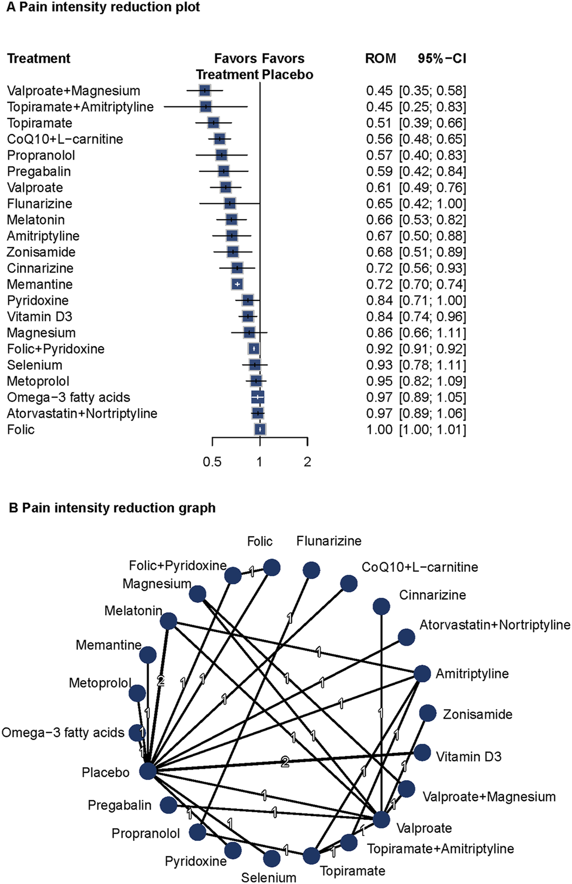 Association of Treatment With Pain Intensity. (A) Pain intensity reduction plot. (B) Pain intensity reduction graph. Forest plot (A) and network graph (B) displaying treatments that were associated with a significant reduction of the self-reported intensity of headaches. Ratio of means (RoM) values were calculated using a fixed-effects model (I2 = 17.8%). Effective treatments included propranolol with valproate with magnesium, topiramate with amitriptyline, topiramate, CoQ10 with L-carnitine, propranolol, pregabalin, valproate, melatonin, amitriptyline, zonisamide, cinnarizine, memantine, and vitamin D3. The analysis incorporated 20 studies (Steiner et al., 1988; Gawel et al., 1992; Pradalier et al., 2001; Ashtari et al., 2008; Afshari et al., 2011; Bostani et al., 2013; Sadeghi et al., 2015; Assarzadegan et al., 2016; Noruzzadeh et al., 2016; Hesami et al., 2018a; Gazerani et al., 2019; Hajihashemi et al., 2019; Ghorbani et al., 2020; Sherafat et al., 2022; Balali et al., 2024; Keskinbora and Aydinli, 2008; Gonçalves et al., 2016; Askari et al., 2017; Ebrahimi-Monfared et al., 2017; Khani et al., 2021).