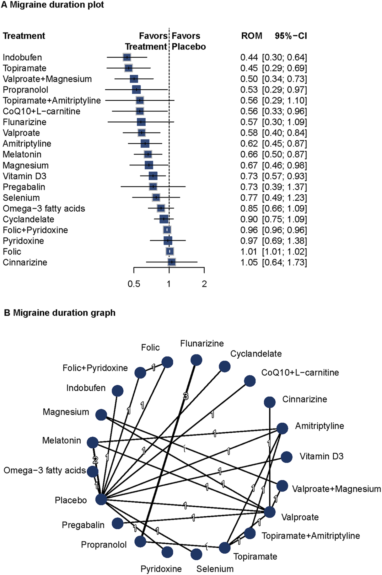 Association of Treatment With Headache Duration. (A) Migraine duration plot. (B) Migraine duration graph. Forest plot (A) and network graph (B) displaying the effect of treatments on the duration of migraine attacks. The data includes the ratio of means (RoM) for each treatment compared with placebo, calculated using a fixed-effects model due to heterogeneity (I2 = 0%). Significant reductions were observed with indobufen, topiramate, volproate with magnesium, propranolol, CoQ10 with l-carnitine, valproate, amitriptyline, melatonin, magnesium, and vitamin d3. The analysis was based on 18 studies (Carrieri et al., 1988; Gawel et al., 1992; Lucking et al., 1988; Diener et al., 2001a; Diener et al., 2001b; Ashtari et al., 2008; Afshari et al., 2011; Bostani et al., 2013; Sadeghi et al., 2015; Hesami et al., 2018a; Hajihashemi et al., 2019; Ghorbani et al., 2020; Balali et al., 2024; Keskinbora and Aydinli, 2008; Gonçalves et al., 2016; Askari et al., 2017; Ebrahimi-Monfared et al., 2017; Khani et al., 2021) with 1809 patients.