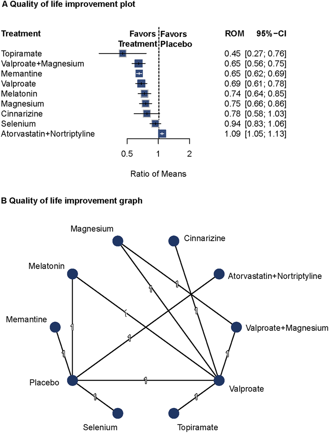 Association of Treatment With Quality of Life. (A) Quality of life improvement plot. (B) Quality of life improvement graph. Forest plot (A) and network graph (B) displaying the association of various treatments with quality of life, measured using the Migraine Disability Assessment tool. Topiramate, valproate with magnesium, memantine, valproate, melatonin, and magnesium showed significant improvements in quality of life compared with placebo. The analysis faced limitations due to the small number of studies per treatment.