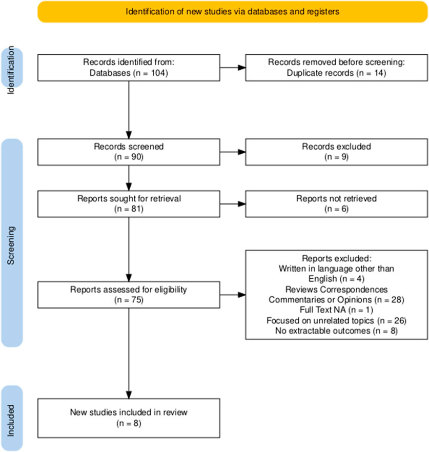 A total of 104 records were identified through a systematic search of PubMed, Embase, Scopus, and the Cochrane Library. After removing 14 duplicates, 90 records were retained for title and abstract screening. Of these, 75 studies were selected for full-text evaluation. Following application of the predefined inclusion and exclusion criteria, 67 studies were excluded for the following reasons: 4 were written in languages other than English; 28 were reviews, correspondences, commentaries, or expert opinions; 1 study did not have full-text availability; 26 focused on unrelated topics, such as preclinical or molecular analyses without clinical endpoints; 8 did not report extractable outcomes on local radiotherapy for oligometastatic ovarian cancer. After the selection process, 8 studies met all inclusion criteria and were included in the final systematic review (Macchia et al., 2020; Shen et al., 2022; Onal et al., 2020; Iftode et al., 2018; Lazzari et al., 2018; Macchia et al., 2025a; Palluzzi et al., 2022; Macchia et al., 2025b). Figure 1 represents the PRISMA flowchart for study selection.