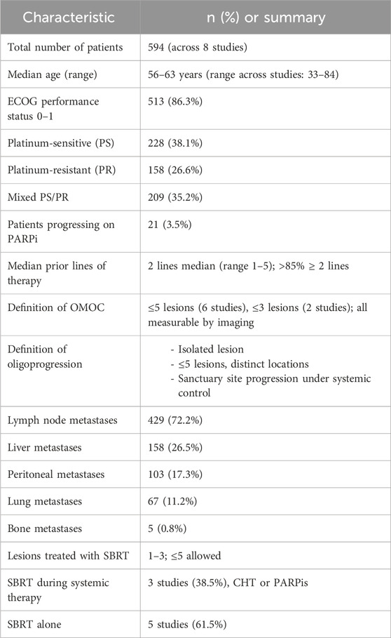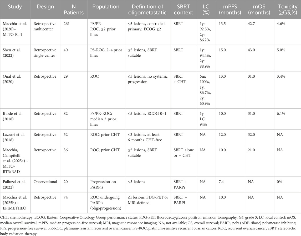 This systematic review includes eight studies, all published between 2020 and 2025, focusing on the role of SBRT as a local ablative treatment in patients with oligometastatic or oligorecurrent OC. All studies were retrospective in design, except for one prospective observational cohort (Palluzzi et al., 2022). To contextualize the clinical utility of SBRT in OMOC, we systematically examined its therapeutic outcomes across diverse patient populations and treatment settings. Across the eight studies, a total of 594 patients were included. The number of patients per study ranged from 20 to 261. SBRT was employed in all cases, either as a standalone modality or in combination with systemic therapy such as chemotherapy or PARPis. No included study used surgery in the treatment of OMOC. The definition of oligometastatic disease varied slightly across studies, although a consistent threshold of ≤5 metastatic lesions was used in six studies. Two studies applied stricter criteria (≤3 lesions), particularly when SBRT was integrated during maintenance therapy or used to manage oligoprogressive disease. Some studies required all lesions to be technically suitable for SBRT (Shen et al., 2022; Macchia et al., 2025a), while others incorporated clinical performance status (e.g., ECOG 0–1 (Iftode et al., 2018; Macchia et al., 2020)). Some studies incorporated imaging-based metabolic criteria, such as FDG-PET positivity or volumetric assessment, to refine eligibility. For example, in Macchia et al., 2025a, both CT and FDG-PET were used to confirm lesion measurability and assess treatment response according to RECIST 1.1 criteria (Macchia et al., 2025b). None of the studies combined SBRT with surgical resection of metastases. Across the included studies, the median PFS (mPFS) ranged from 7.4 to 15.0 months, and the median OS (mOS), when reported, ranged from 21.0 to 43.0 months. Local control (LC) at 1 year ranged from 86.7% to 94.4%, and 2-year LC was reported between 60.9% and 88.9%. Grade ≥3 toxicity was rare, ranging from 0% to 6.1%, with no treatment-related deaths reported. These outcomes were seen in populations with both platinum-sensitive and platinum-resistant disease and patients treated with SBRT either as part of a treatment-free interval, during PARPi maintenance, or in chemo-free settings.
