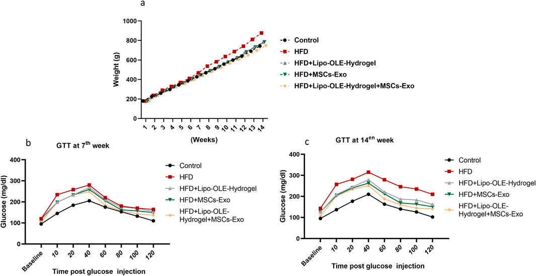 Figure 2. Changes of body weight (a) and blood glucose intolerance test at the 7th week (b) and the 14th week (c) in response to Lipo-OLE-Hydrogel and/or MSC-Exo treatment. Control (group fed the standard diet); HFD [group fed a high-fat diet (60% Kcal)]; HFD +Lipo-OLE-Hydrogel (group fed a high-fat diet (60% Kcal and treated with olive-leaf-encapsulated liposomal hydrogel); HFD + MSC-Exo (group fed a high-fat diet and treated with mesenchymal stem cell exosomes); HFD + Lipo-OLE-Hydrogel + MSC-Exo (group fed a high-fat diet and treated with olive-leaf-encapsulated liposomal hydrogel and mesenchymal stem cell exosomes). Data are expressed as means ± SE. Bars with altered letters imply significant variations (P < 0.05).