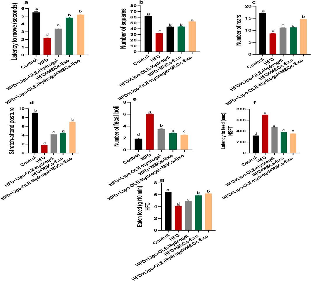 Figure 3. Changes in behavioral and anxiety tasks: latency to move (a), the number of boxes entered by the rat (b), the number of rears (c), stretch-attend posture (d), and the number of fecal boli (e), latency to feed (f), and feed eaten in home cage (g) in response to Lipo-OLE-Hydrogel and/or MSC-Exo treatment. Control (group fed the standard diet); HFD [group fed a high-fat diet (60% Kcal)]; HFD +Lipo-OLE-Hydrogel [group fed a high-fat diet (60% Kcal) and treated with olive-leaf-encapsulated liposomal hydrogel]; HFD + MSC-Exo (group fed a high-fat diet and treated with mesenchymal stem cell exosomes); HFD + Lipo-OLE-Hydrogel + MSC-Exo (group fed a high-fat diet and treated with olive-leaf-encapsulated liposomal hydrogel and mesenchymal stem cell exosomes). Data are expressed as means ± SE. Bars with altered letters imply significant variations (P < 0.05).
