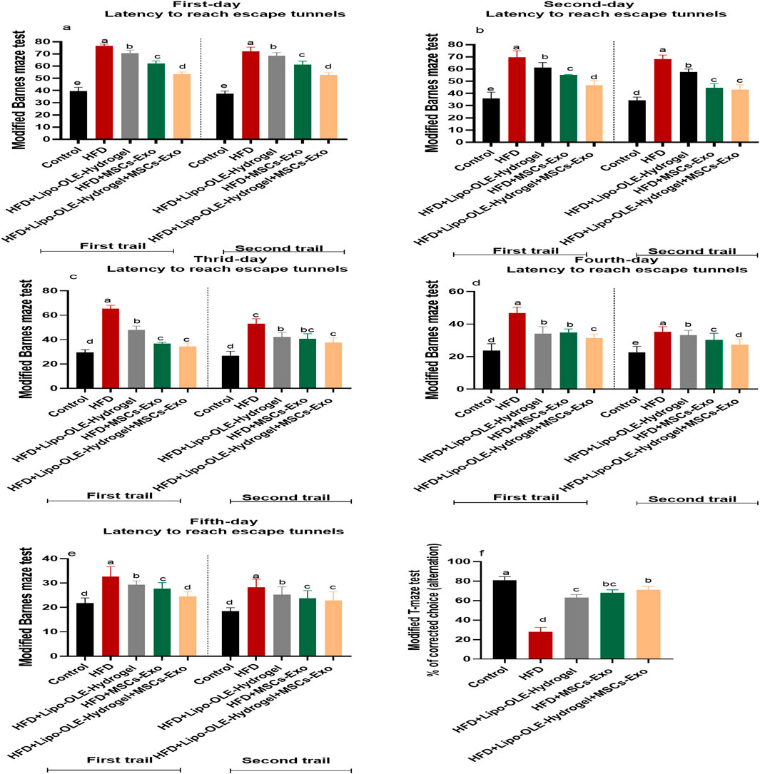 Figure 4. Changes in working and learning memory of HFD-fed rats in response to Lipo-OLE-Hydrogel + MSC-Exo treatment. Modified Barnes maze test (a–e) and modified T-maze test (f). Control (group fed the standard diet); HFD [group fed a high-fat diet (60% Kcal]; HFD +Lipo-OLE-Hydrogel [group fed a high-fat diet (60% Kcal) and treated with olive-leaf-encapsulated liposomal hydrogel]; HFD + MSC-Exo (group fed a high-fat diet and treated with mesenchymal stem cell exosomes); HFD + LIPO-OLE-Hydrogel + MSC-Exo (group fed a high-fat diet and treated with olive-leaf-encapsulated liposomal hydrogel and mesenchymal stem cell exosomes). Data are expressed as means ± SE. Bars with altered letters imply significant variations (P < 0.05).