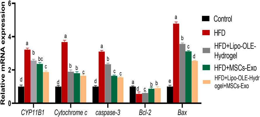 Figure 6. Changes cytochrome P450 family 11 subfamily B member (CYP11B1), pro-apoptotic genes [Cytochrome c, caspase-3], and anti-apoptotic genes [cell lymphoma-2 (Bcl-2) and Bcl-2 associated x protein (Bax)] in response to Lipo-OLE-Hydrogel and/or MSC-Exo treatment. Control (group fed the standard diet); HFD [group fed a high-fat diet (60% Kcal)]; HFD + LIPO-OLE-Hydrogel [group fed a high-fat diet (60% Kcal) and treated with olive-leaf-encapsulated liposomal hydrogel]; HFD + MSC-Exo (group fed a high-fat diet and treated with mesenchymal stem cell exosomes); HFD + LIPO-OLE-Hydrogel + MSC-Exo (group fed a high-fat diet and treated with olive-leaf-encapsulated liposomal hydrogel and mesenchymal stem cell exosomes). Data are expressed as means ± SE. Bars with altered letters imply significant variations (P < 0.05).