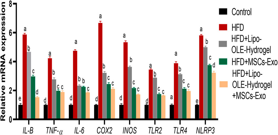 Figure 7. Changes in inflammatory mediators [tumor necrosis factor alpha (TNF-α), interleukin (IL-6 and IL-β)], cyclooxygenase-2 (COX-2), inducible nitric oxide synthase (iNOS), toll-like receptors (TLR2 and TLR9), pyrin domain-containing protein 3 (NLRP3) inflammasome in response to Lipo-OLE-Hydrogel and/or MSC-Exo treatment. Control (group fed the standard diet); HFD [group fed a high-fat diet (60% Kcal)]; HFD + Lipo-OLE-Hydrogel [group fed a high-fat diet (60% Kcal) and treated with olive-leaf-encapsulated liposomal hydrogel]; HFD + MSC-Exo (group fed a high-fat diet and treated with mesenchymal stem cell exosomes); HFD + Lipo-OLE-Hydrogel + MSC-Exo (group fed a high-fat diet and treated with olive-leaf-encapsulated liposomal hydrogel and mesenchymal stem cell exosomes). Data are expressed as means ± SE. Bars with altered letters imply significant variations (P < 0.05).