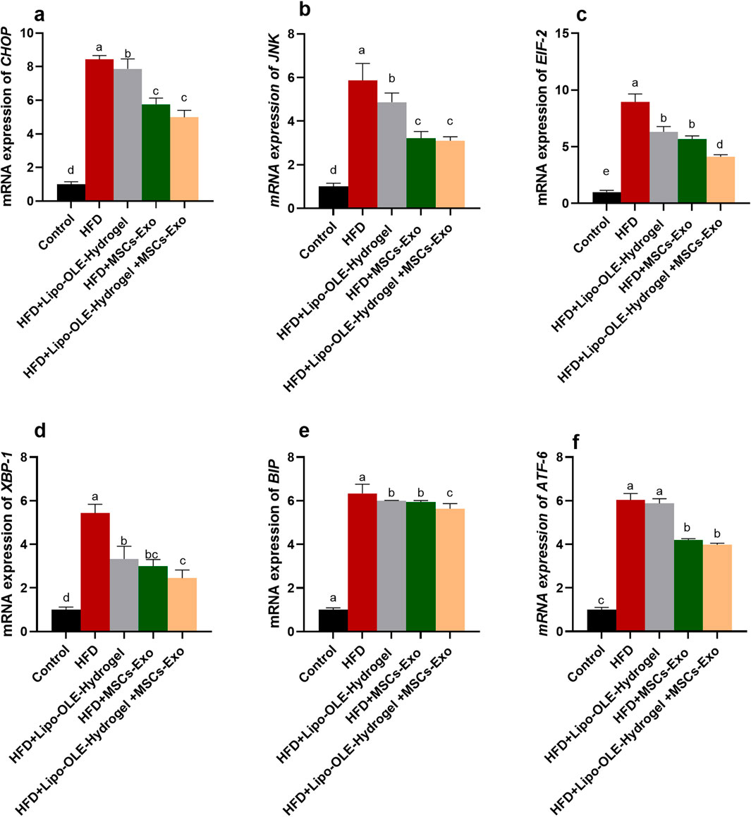 Figure 8. Assessment of endoplasmic stressor-related genes {C/EBP homologous protein [CHOP, (a)], c-Jun N-terminal kinase [JNK, (b)], eukaryotic initiation factor 2α [eIF2α, (c)], X-box-binding protein-1 [XBP1, (d)], Immunoglobulin-binding protein [BIP, (e)], activating transcription factor [ATF-6, (f)]} of HFD-fed rats in response to MSC-Exo + Lipo-OLE-Hydrogel treatment. Control (group fed the standard diet); HFD [group fed a high-fat diet (60% Kcal)]; HFD +LIPO-OLE-Hydrogel [group fed a high-fat diet (60% Kcal) and treated with olive-leaf-encapsulated liposomal hydrogel]; HFD + MSC-Exo (group fed a high-fat diet and treated with mesenchymal stem cell exosomes); HFD + Lipo-OLE-Hydrogel + MSC-Exo (group fed a high-fat diet and treated with olive-leaf-encapsulated liposomal hydrogel and mesenchymal stem cell exosomes). Data are expressed as means ± SE. Bars with altered letters imply significant variations (P < 0.05).
