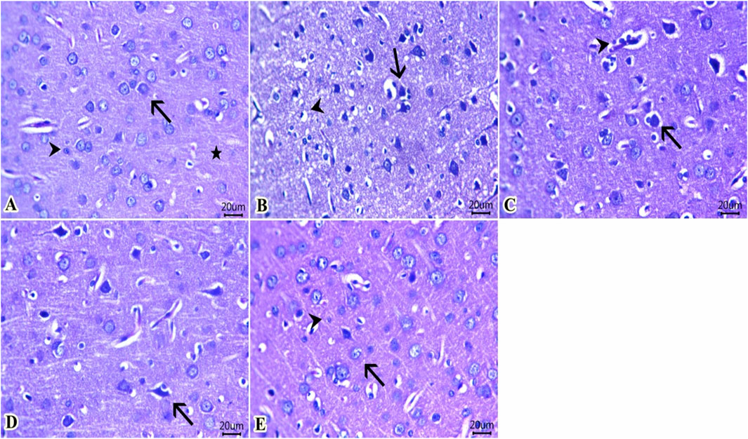 Figure 9. Representative photomicrograph of H&E-stained sections from cerebral cortex (Scale bar 20 μm) showing: (A) Normal histological structures of neuronal bodies (arrow), glia cells (arrowhead), and neuropil (star) in the control group. (B) A large number of pyknotic neurons surrounded by glial cells (arrow) and vacuolated neuropil (arrowhead) in rats fed an HFD without treatment. (C) A moderate number of shrunken neuron cell bodies (arrow) beside a minute number of lymphocytes within the Virchow–Robin space (arrowhead) were found in rats fed an HFD and treated with Lipo-OLE-Hydrogel. (D) A few pyknotic neurons with clear halos (arrow) were found in rats receiving an HFD and treated with MSC-Exo. (E) Preserved histological configurations of neurons (arrow) and glial cells (arrowhead) were found in rats fed an HFD and treated with a combined therapy of LIPO-OLE-Hydrogel and MSC-Exo.