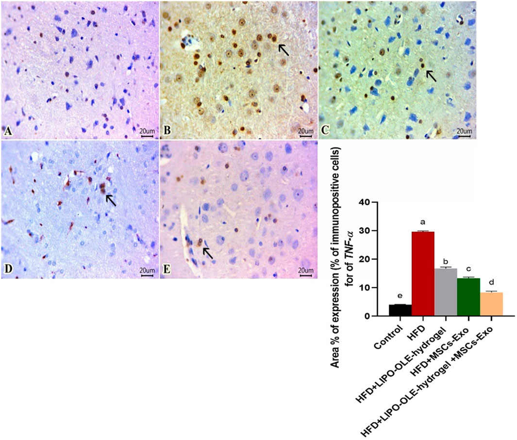 Figure 10. Photomicrographs of immuno-stained sections from brain tissues (scale bar 20μm) for TNF-α showing apparently negative immuno-labeled cells found in the control group fed the standard diet (A). Many positive cells were noted in the group fed an HFD without treatment (B). A moderate number of stained cells were observed in rats fed an HFD and treated with Lipo-OLE-Hydrogel (C). Mild expression was detected in rats that received an HFD and were treated with MSC-Exo (D). Few expressed cells were detected in rats fed an HFD and treated with a combined therapy of Lipo-OLE-Hydrogel and MSC-Exo (E). The positively stained cells exhibited a brown color. The arrow demonstrates the positive cells. IHC counterstaining was done with Mayer’s hematoxylin.