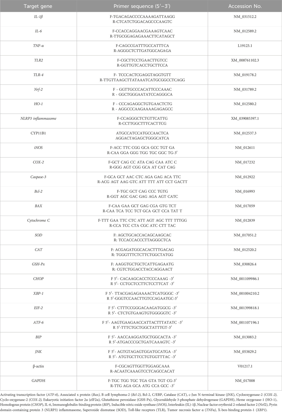 Total RNA was isolated from the collected brain tissues utilizing RNeasy Mini kits (Qiagen, CA, USA) in accordance with the protocol guidelines. The purity and quantity of the extracted RNA were assessed via a NanoDrop™ ND-1000 Spectrophotometer (Thermo Fisher Scientific Inc., Waltham, MA, USA). Extracted RNA was reverse-transcribed into cDNA using a Maxima First-Strand cDNA Synthesis kit (Thermo Scientific, USA). Synthesis of cDNA was done at a 60-min incubation at 37 °C for activation, then heating to 95 °C for 5 min, and ultimately, a holding temperature of 4 °C (thermal cycler with Averitt 96-well, Applied Biosystems, Foster City, CA, United States). Brain tissues were used for evaluating the expression of genes encoding cytokines [interleukin (IL)-1β, IL-6, tumor necrosis factor α (TNF-α)] and other inflammatory markers [cyclooxygenase-2 (COX-2), toll-like receptors (TLR2 and TLR4) and inducible nitric oxide synthase (iNOS)] and pyrin domain-containing protein 3 (NLRP3) inflammasome, anti-apoptotic genes and pro-apoptotic genes [C/EBP homologous protein (CHOP), c-Jun N-terminal kinase (JNK), eukaryotic initiation factor 2α (eIF2α), activating transcription factor (ATF-6), X-box-binding protein-1 (XBP1)], immunoglobulin-binding protein (BIP), and oxidative stress-related genes [glutathione peroxidase (GSH-Px), catalase, superoxide dismutase (SOD), heme oxygenase-1 (HO-1), and nuclear factor erythroid 2-related factor 2 (Nrf2]. Stress-induced genes [Cytochrome P450 Family 11 Subfamily B Member 1 (CYP11B1), cytochrome c, and caspase-3]. The expression levels of inflammation and apoptosis-associated target genes were assessed through quantitative real-time PCR (qRT-PCR) utilizing a SYBR green kit (Qiagen, Hilden, Germany) and precise primers for the respective marked genes. All PCRs were accomplished in triplicate using the Stratagene MX3005P real-time PCR system (Stratagene, La Jolla, CA, United States). The gene expression profiles were considered employing the 2–ΔΔCT method (Livak and Schmittgen, 2001), where β-actin served as a stable endogenous control gene. The sequences of the gene-target primers are listed in Table 1.