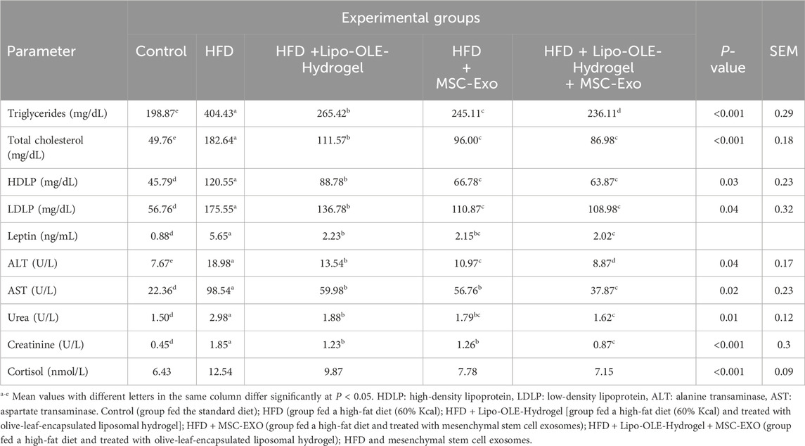 Table 2 described the changes in lipid profile, leptin hormone level, liver, and kidney function markers in high-fat diet (HFD)-induced obese rats in response to the Lipo-OLE-Hydrogel + MSC-Exo treatment. Remarkably, all groups fed an HFD and treated either with MSC-Exo alone or in combination with Lipo-OLE-Hydrogel showed significantly decreased (P < 0.05) levels of triglycerides, total cholesterol, LDLP-C, leptin hormone, and cortisol. HDL-C levels were notably higher in the groups treated with MSC-Exo or the combined Lipo-OLE-Hydrogel + MSC-Exo therapy, which remained within the normal range, followed by the group treated with Lipo-OLE-Hydrogel alone, compared to the untreated HFD group. The most pronounced reductions in ALT, AST, urea, and creatinine were observed in the group receiving the combined Lipo-OLE-Hydrogel + MSC-Exo treatment.