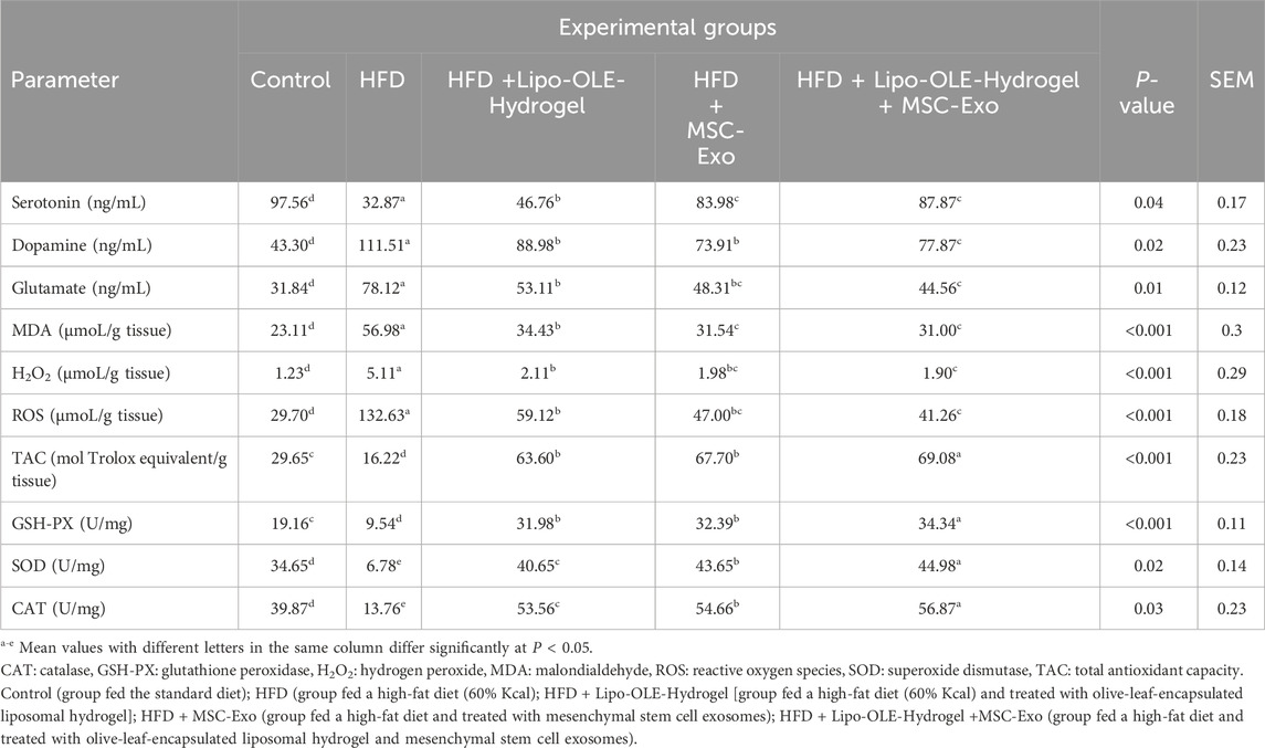 Notably, all HFD-fed groups showed significantly increased levels of MDA, H2O2, and ROS, along with reduced total antioxidant capacity (TAC) and antioxidant enzyme activity, compared to the control group (Table 3). Remarkably, the group treated with Lipo-OLE-Hydrogel + MSC-Exo exhibited significantly lower levels of MDA, H2O2, and ROS (31.00, 1.90, and 41.26, respectively) compared to the untreated HFD group (56.98, 5.11, and 132.63, respectively), alongside a notable increase in TAC (69.08 vs. 29.70). Groups treated with MSC-Exo alone or in combination with Lipo-OLE-Hydrogel also displayed significantly diminished (P < 0.05) serotonin levels, unlike the untreated HFD group. While HFD elevated dopamine and glutamate levels, treatment with Lipo-OLE-Hydrogel + MSC-Exo significantly (P < 0.05) reduced these levels, irrespective of continued HFD feeding.